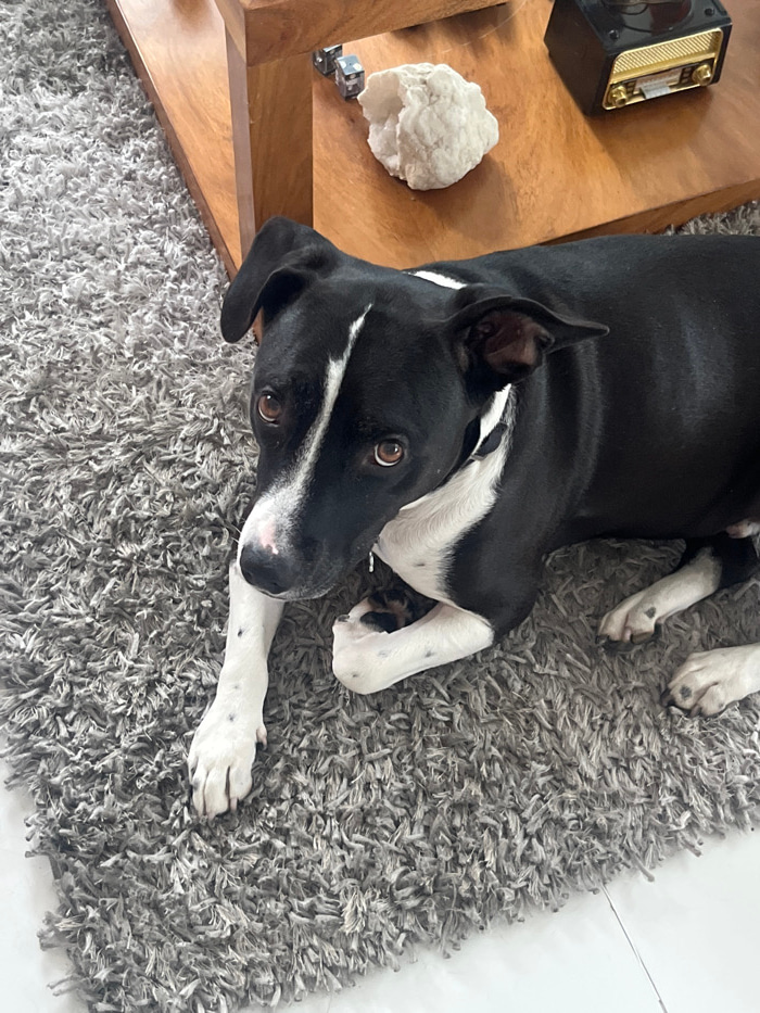 A black and white dog lies on a gray shag rug, looking up at the camera with brown eyes. The dog's head is near a wooden side table, upon which sits a small, vintage-style radio and a white crystal. T…read more