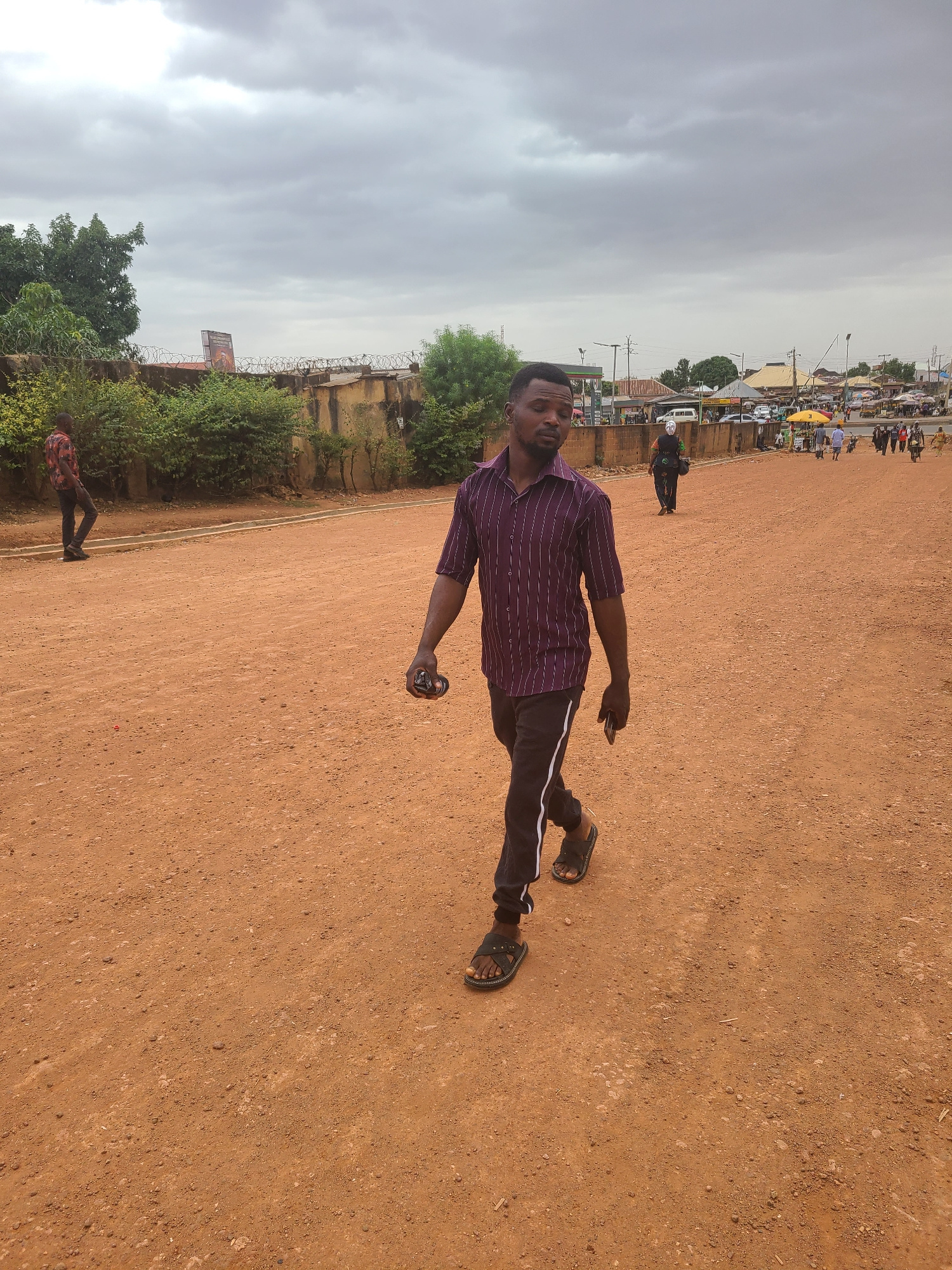 A man is standing on a dirt field in what appears to be Jos, Nigeria. He is wearing a purple striped shirt, black pants with a white stripe, and sandals. He is holding a small, round object in his rig…read more