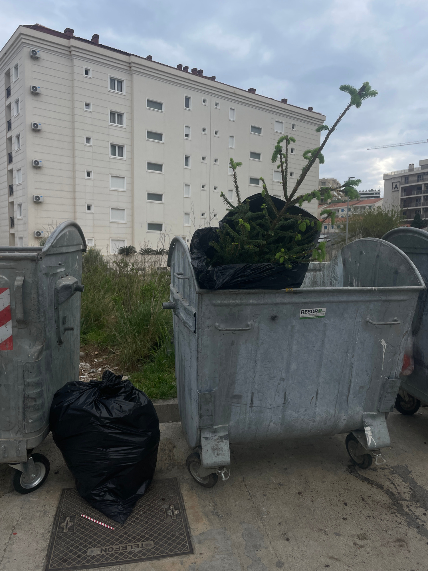 The photograph captures a waste disposal scene in Boreti, Montenegro. A large, galvanized metal dumpster stands on a concrete surface adjacent to a sidewalk or paved area. The dumpster is partially filled with a discarded Christmas tree placed inside a black plastic bag, some branches protruding from the top. Another black plastic bag filled with waste is positioned near the dumpster's base, close to a manhole cover with "TELEFON" inscribed on it. In the background, a multistory residential building with numerous windows and air conditioning units is visible, suggesting an urban setting. The sky is overcast, hinting at a dreary weather condition. The image depicts the disposal of seasonal waste and typical features of an urban residential environment in Boreti. | Open Wire