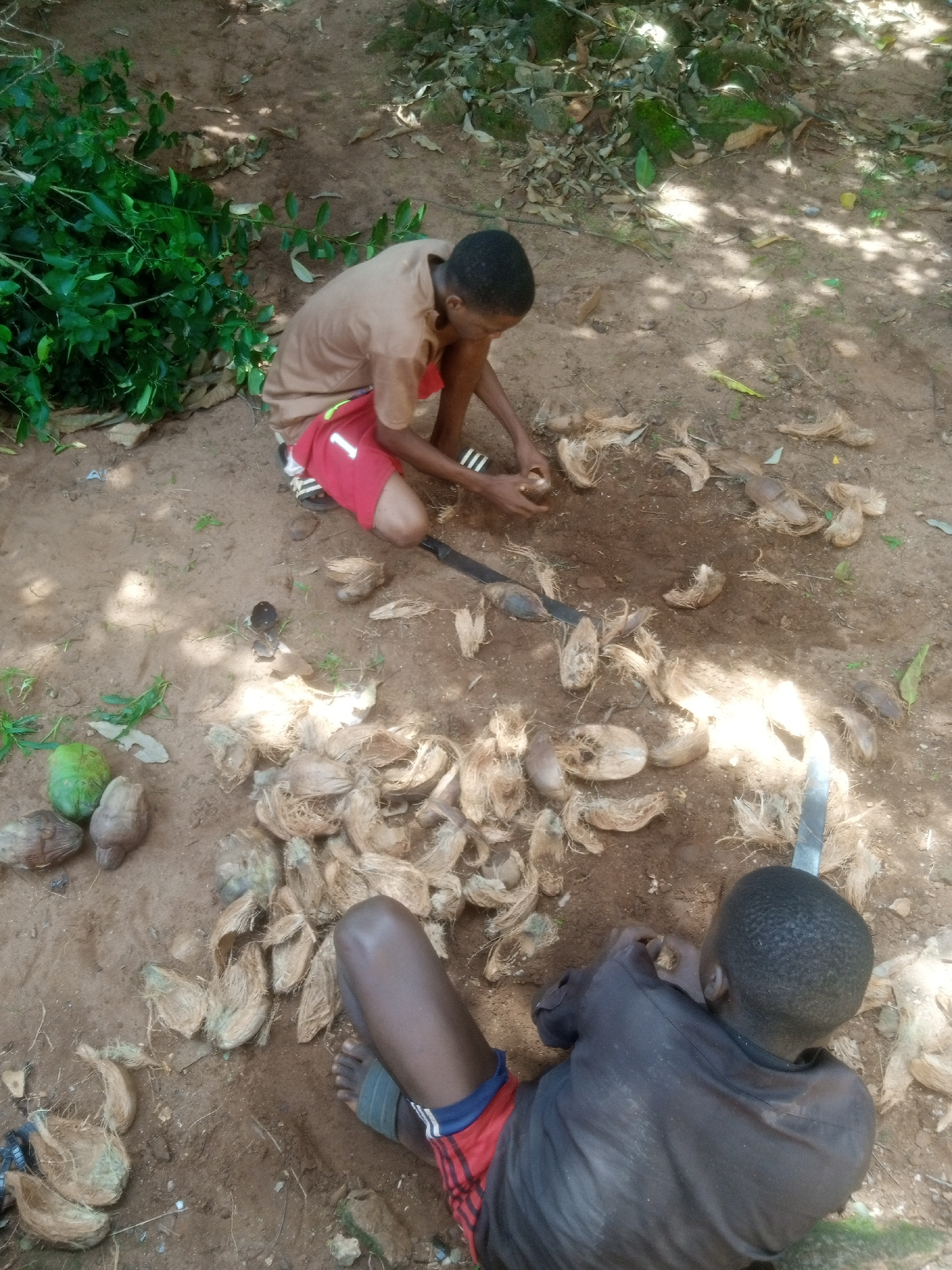 Two individuals are processing coconuts in an outdoor setting, likely within Ukwu-Abwa, Nigeria. One person, wearing a tan shirt and red shorts, is kneeling and appears to be manually removing the hus…read more