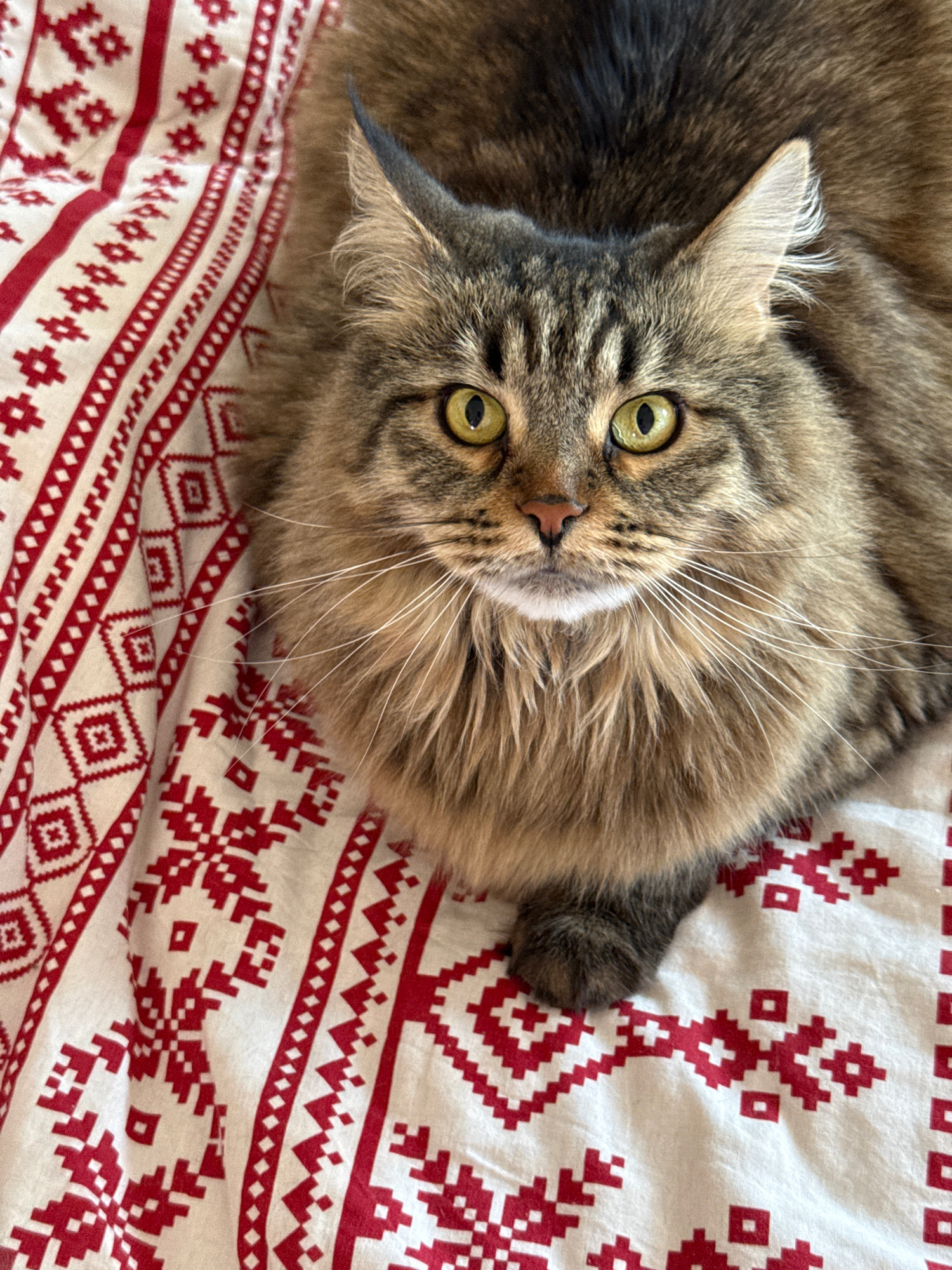 A medium shot of a tabby cat with green eyes lying on a white blanket with a red patterned design. The cat is looking up at the camera. The cat's fur is long and brown, with white whiskers. The blanke…read more