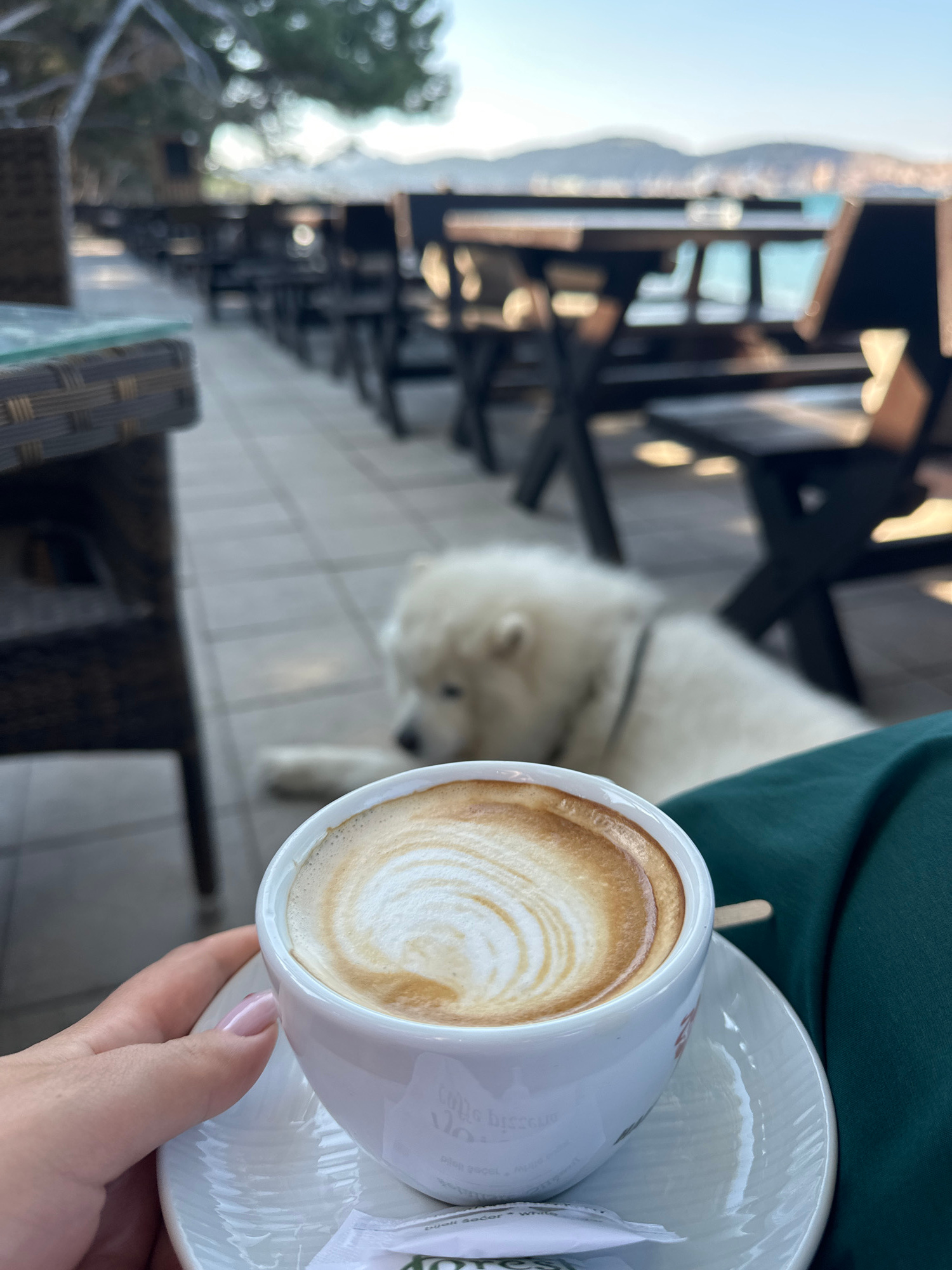 A person is holding a cup of coffee with latte art in their right hand, with a saucer underneath. Behind the cup, out of focus, is a white dog with its head slightly down. The background consists of w…read more