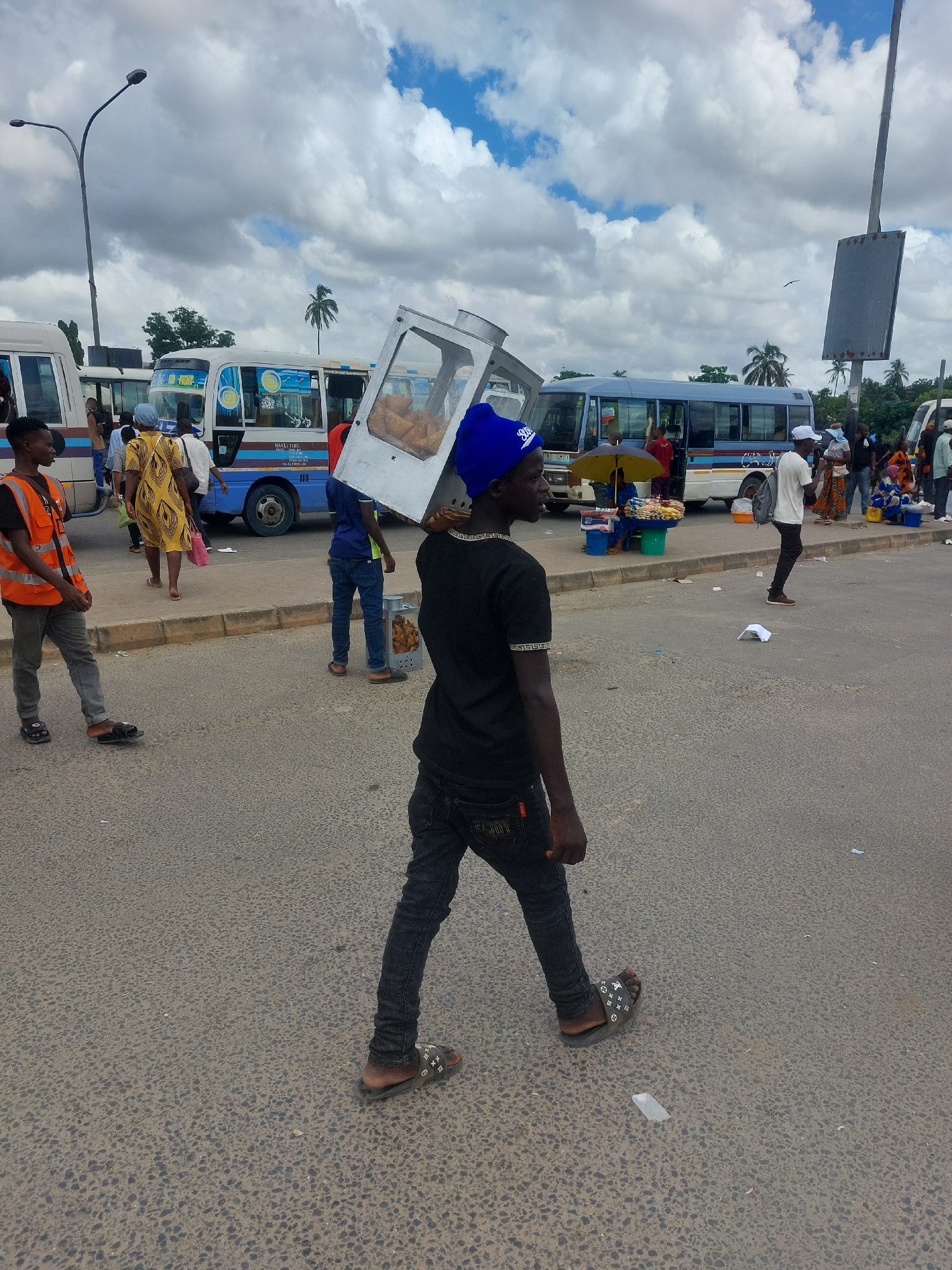 The image depicts a street scene in Dar es-Salaam, Tanzania. Several white minibuses are parked along the side of a road, with people standing around them. Some individuals appear to be selling snacks from a glass display case mounted on one of the buses. The road is paved and leads into the distance. The sky is partially cloudy. A man in black clothing and sandals stands on the road, facing the direction of the parked buses. Other individuals are visible further down the road, including someone wearing a bright orange vest. A light pole and a sign are visible on the left side of the image. | Open Wire