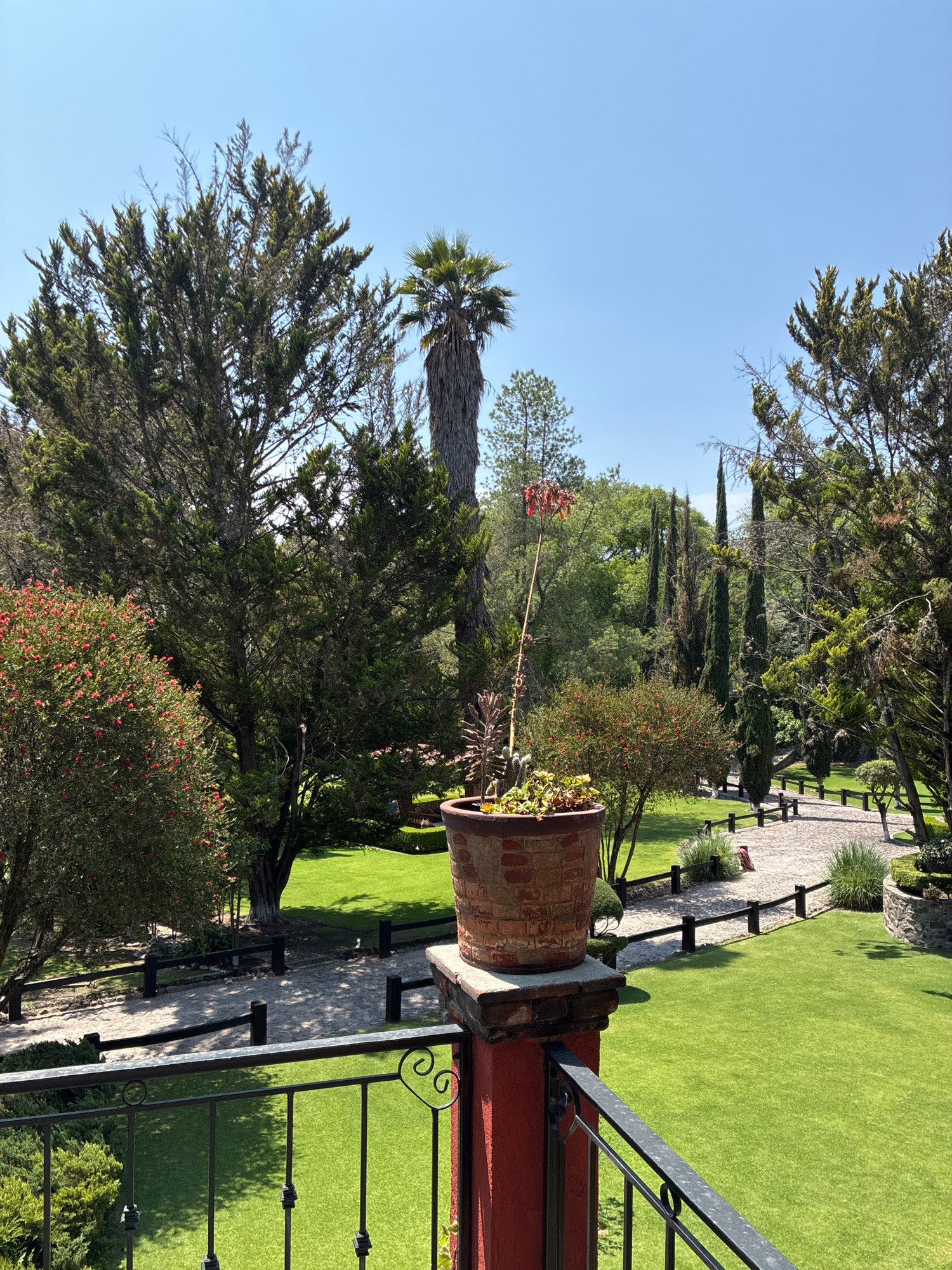 The image presents an outdoor scene in what appears to be a well-maintained garden. A tiled pathway meanders through a manicured lawn, lined with dark-colored fence posts. The vantage point is from a…read more