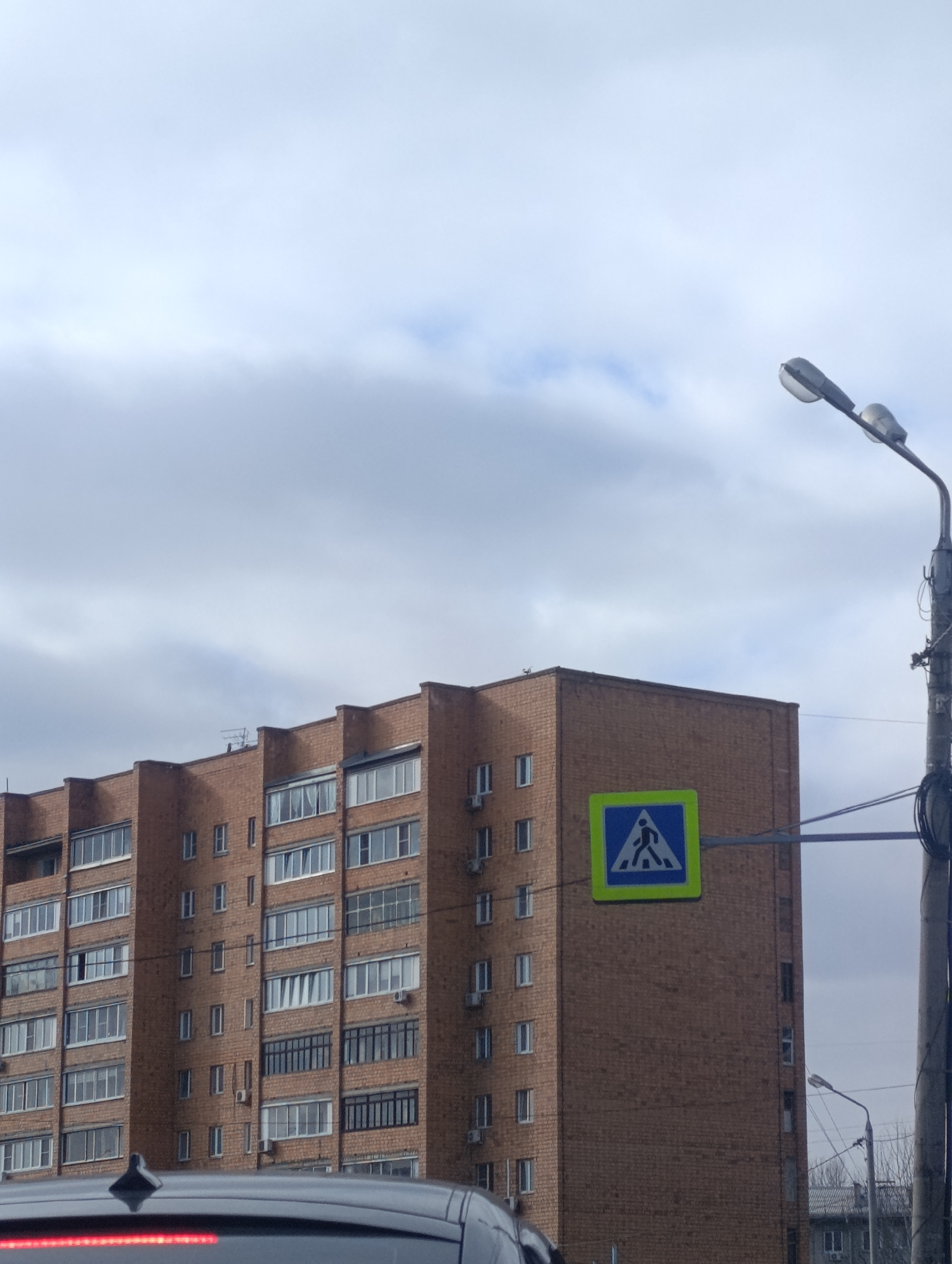 The image depicts an urban street scene featuring a large brick apartment building under an overcast sky. The multi-story building, constructed from reddish-brown brick, is a prominent subject, charac…read more