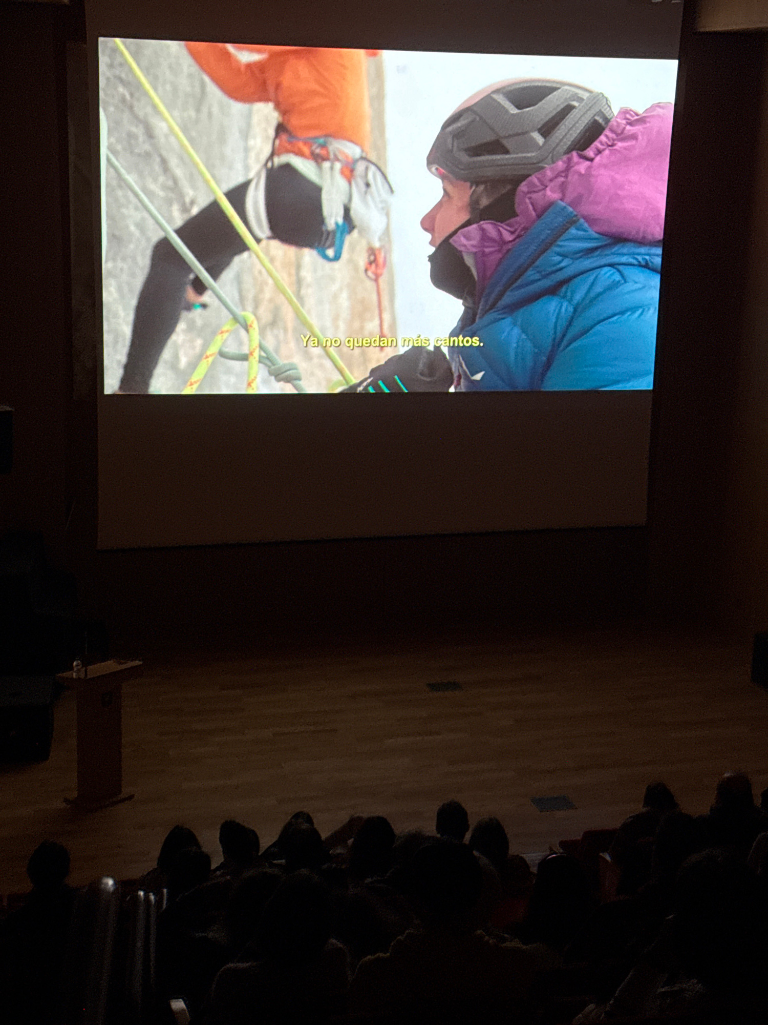 A presentation screen in a dim room shows a scene of what appears to be a mountain climber in action, wearing protective gear including a helmet, an orange top, and black climbing pants. Climbing rope…read more