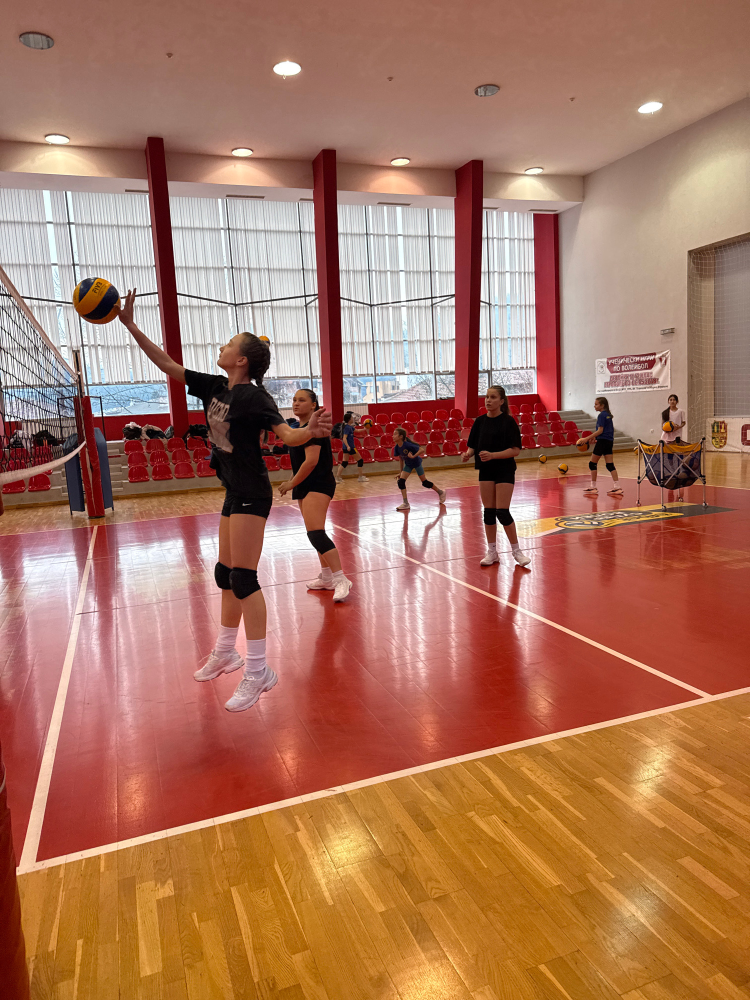 The scene is a volleyball court located indoors. A young woman in black athletic wear is positioned near the volleyball net, reaching out to hit a yellow and blue volleyball. She is wearing knee pads…read more