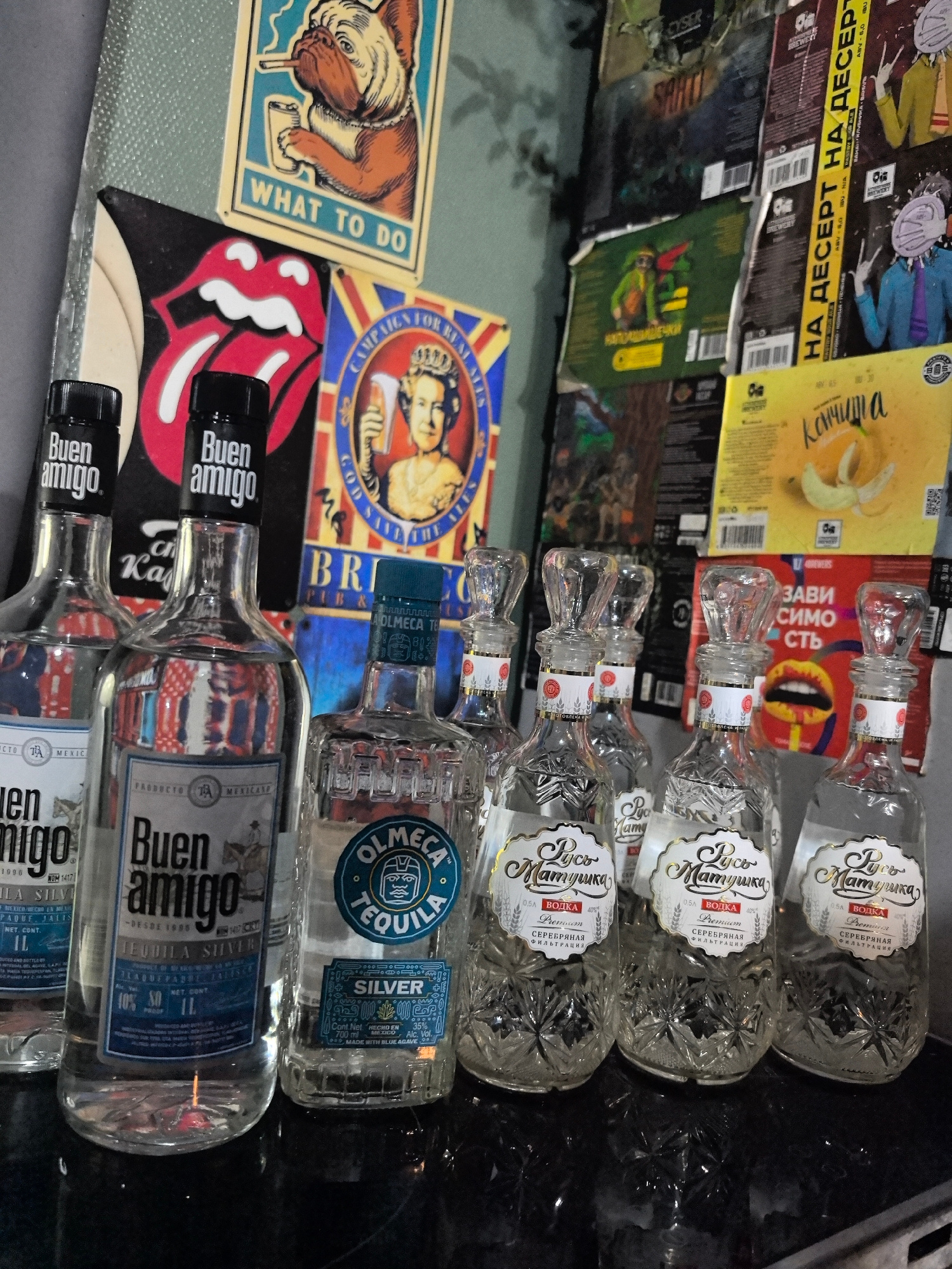 The image presents a variety of alcoholic beverages on a dark surface, possibly a bar counter, in front of a wall decorated with an assortment of posters and labels. Two bottles of "Buen Amigo" tequil…read more