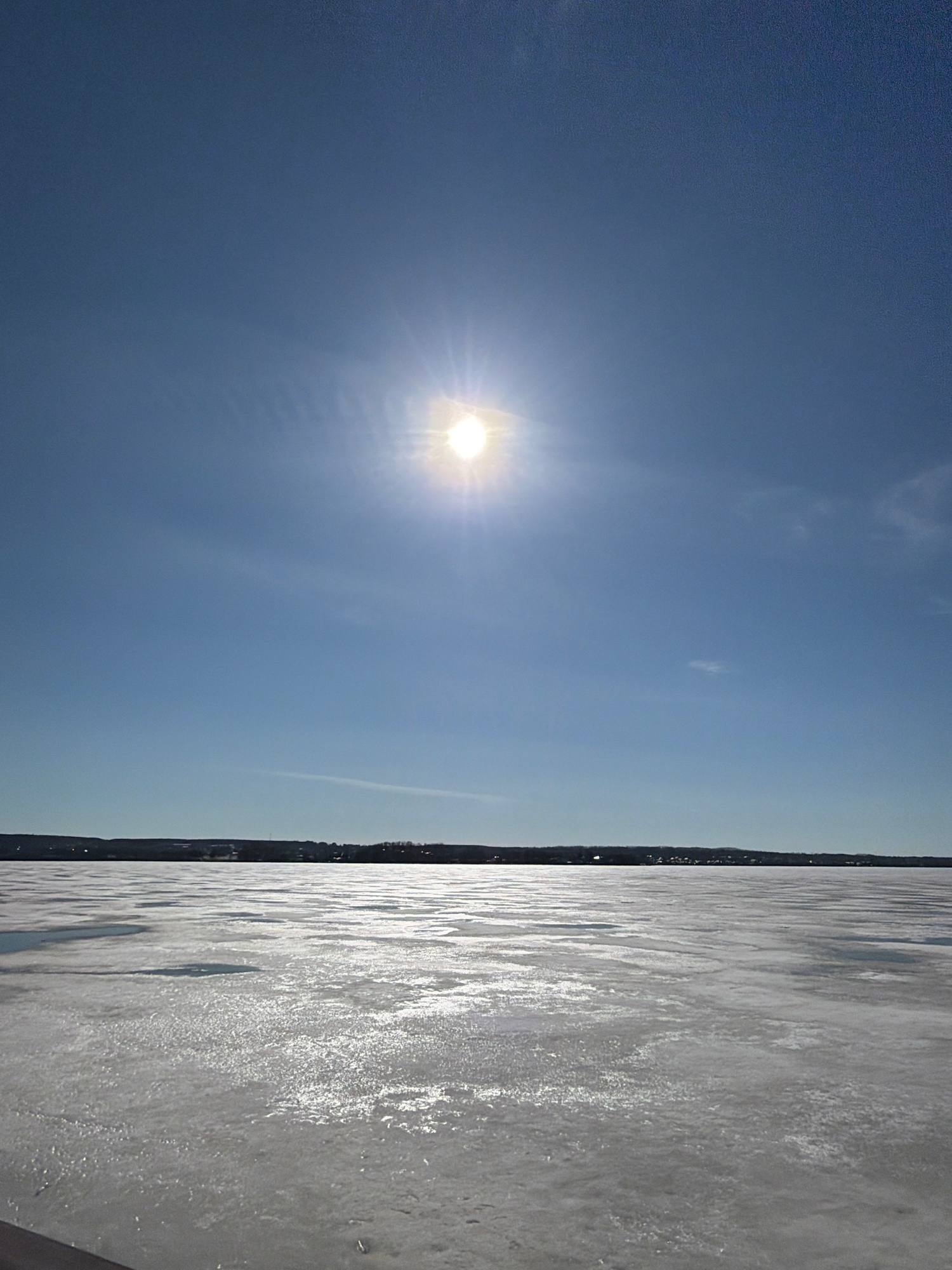 The image depicts an expansive outdoor winter landscape, featuring a bright sky and a large frozen body of water under clear conditions. The horizon line stretches across the middle of the frame, divi…read more