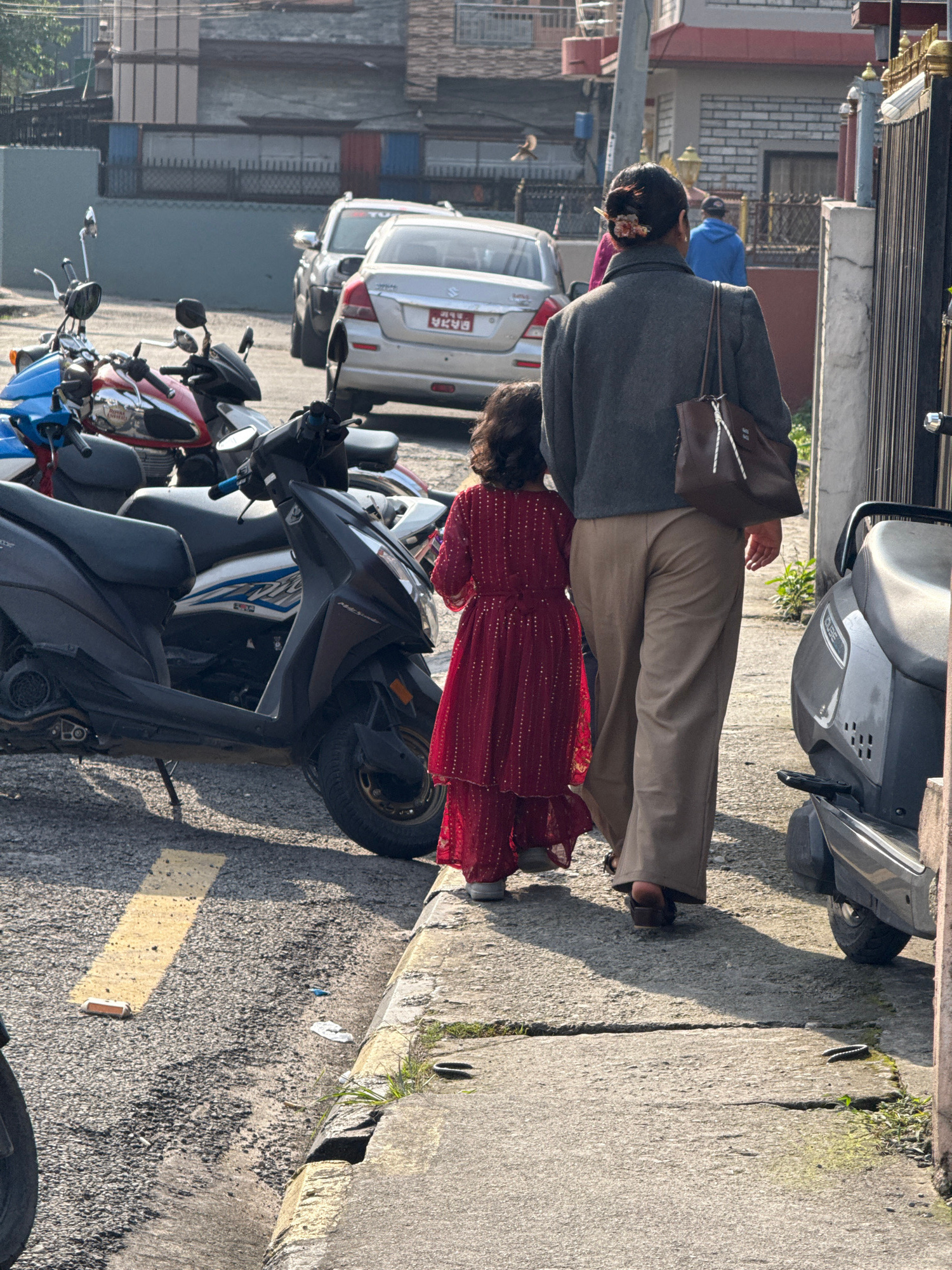 The image depicts a street scene in Pokhara, Nepal. A woman with a flower in her hair, wearing a gray sweater and tan pants, stands next to a younger female wearing a red, sequined dress. They stand o…read more