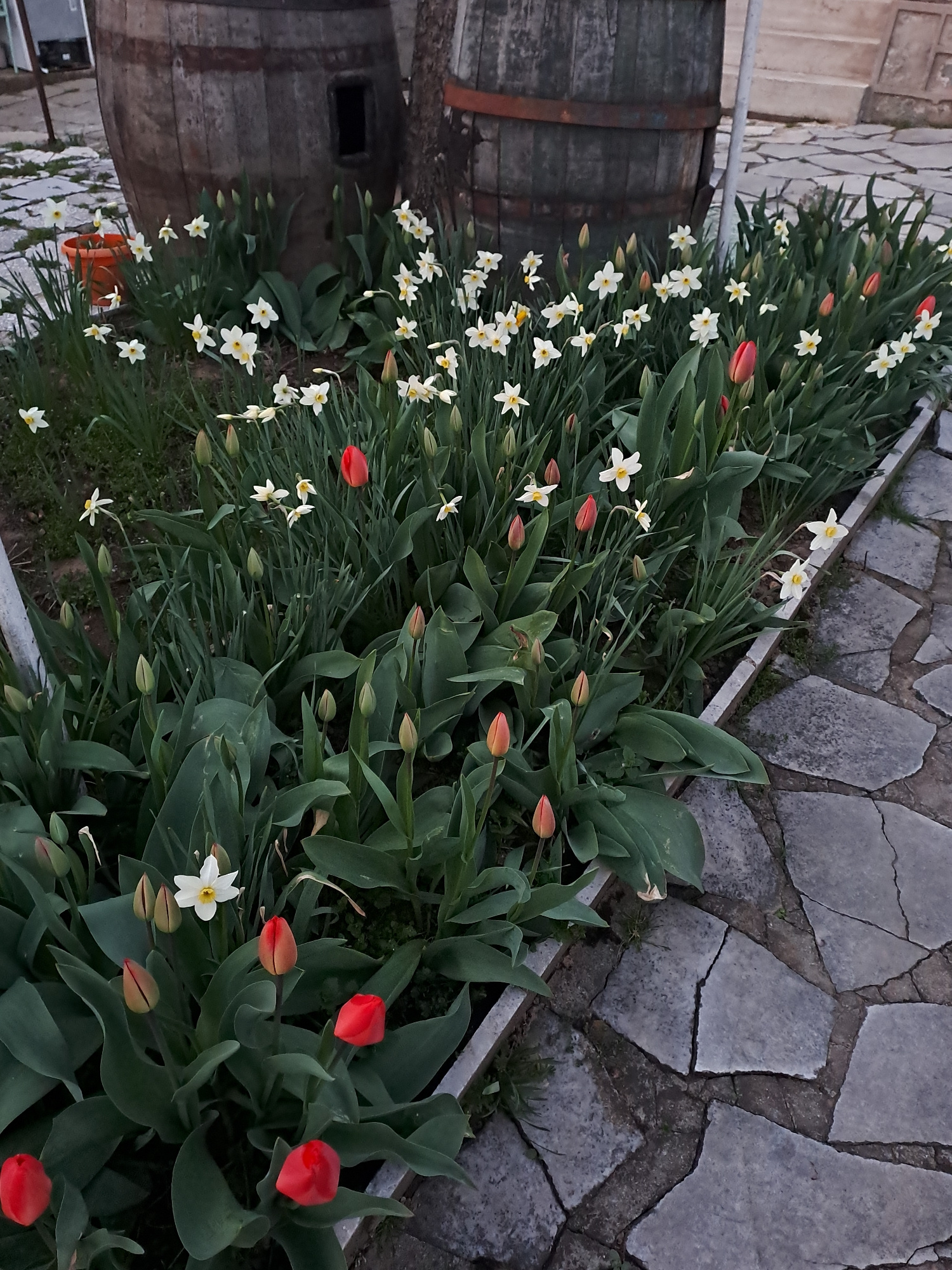 A flower bed lines a stone walkway in Spanchevtsi, Bulgaria. White daffodils intermingle with tulips, some budding and some blooming red. The flower bed is bordered by a weathered wooden barrel on oneβ¦read more