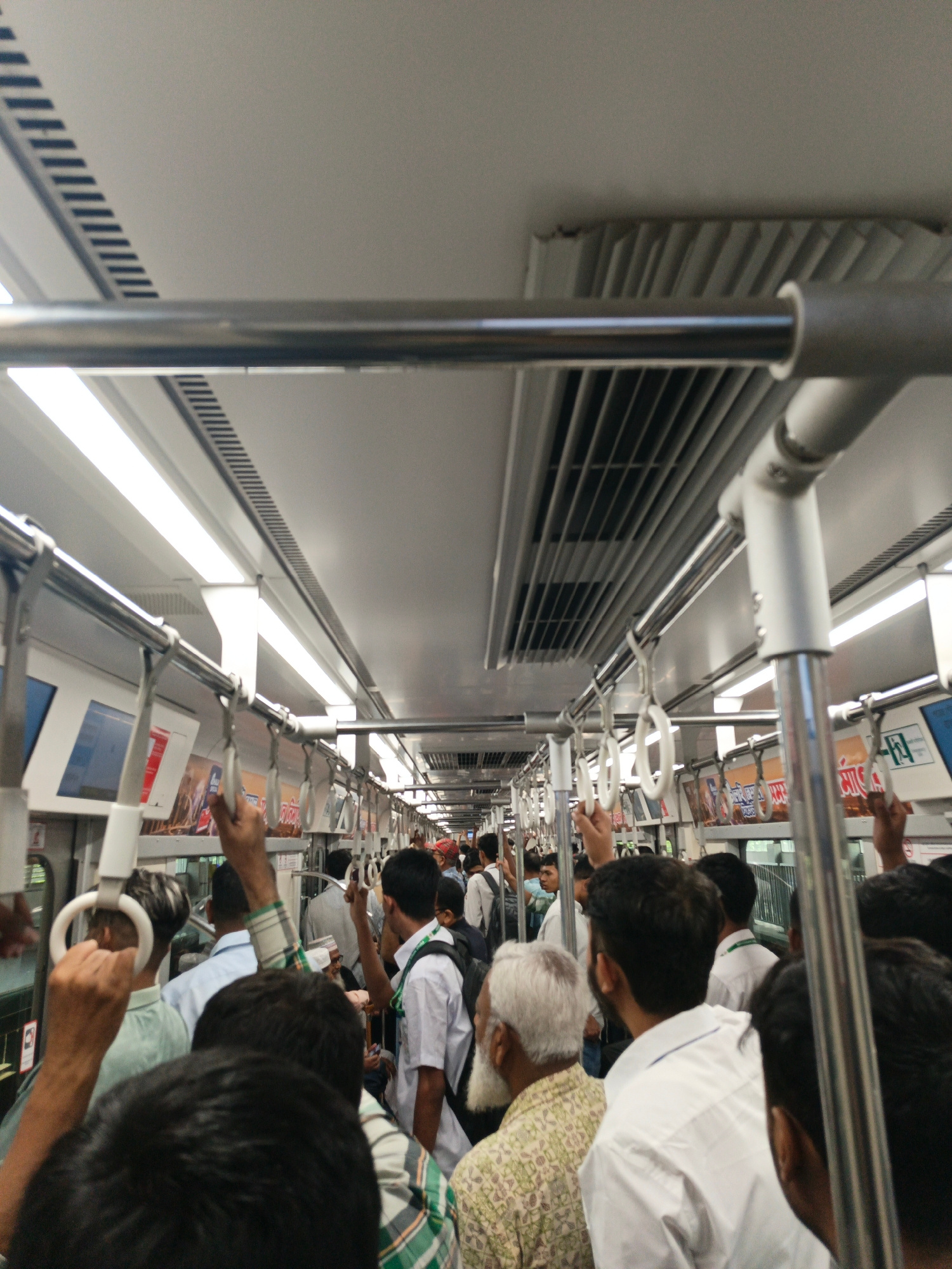 The image depicts a crowded train car, likely in Dhaka, Bangladesh based on the presence of people and the signage. The car is filled with passengers, mostly men, standing closely together. Many are h…read more
