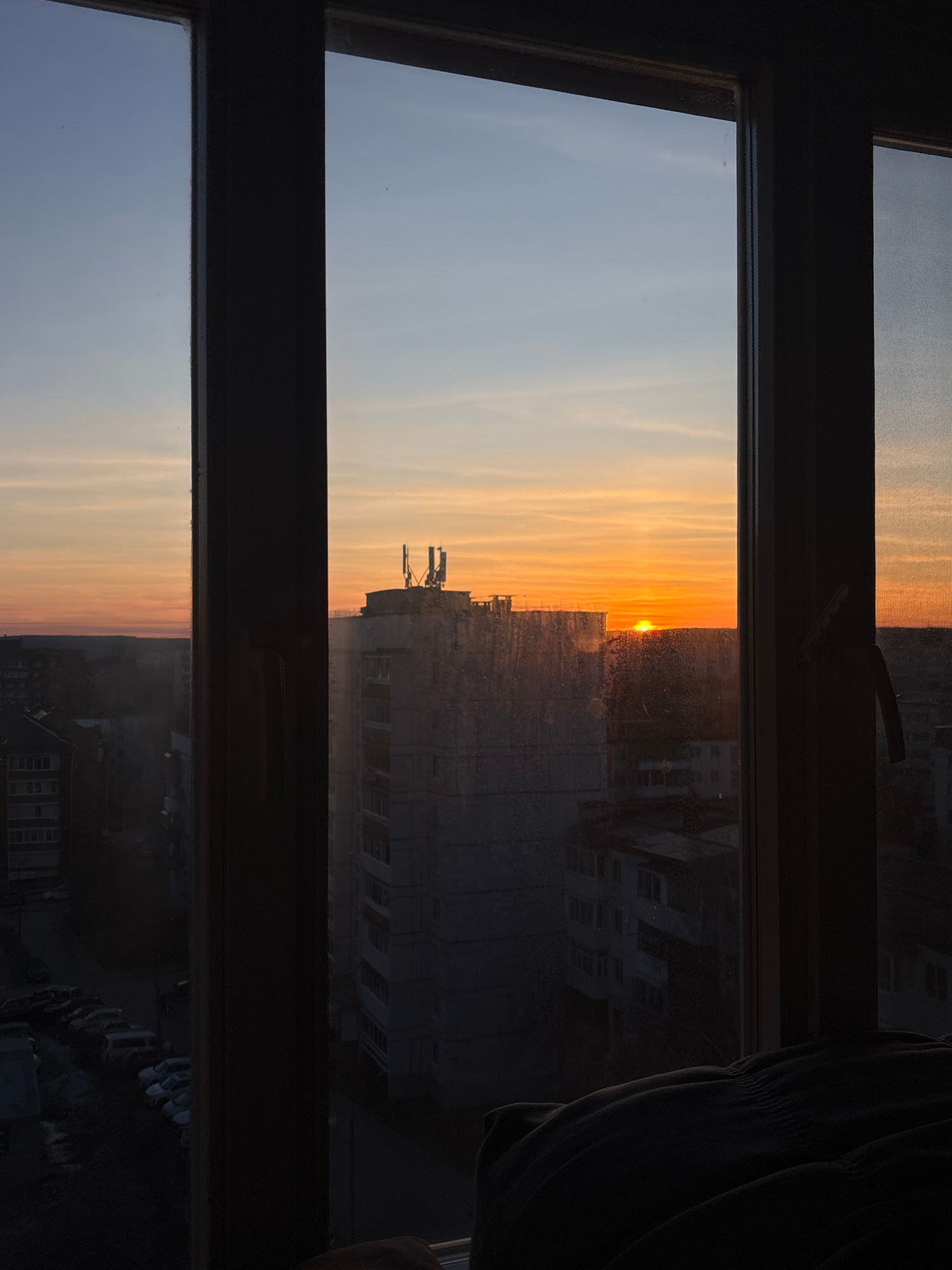 A photograph captures a vibrant sunset or sunrise viewed through a window overlooking an urban landscape in Chaikovsky, Russia. The sun, a bright orange sphere, is low on the horizon, bathing the sky…read more