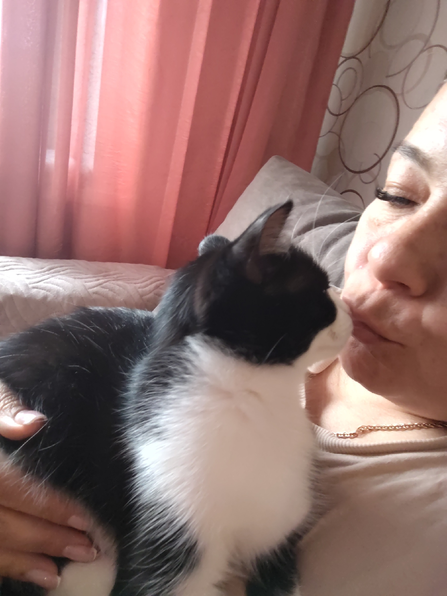 A woman is holding a black and white cat close to her face. The cat's head is near the woman's mouth, and they appear to be kissing or nuzzling. The woman is wearing a beige top and a gold necklace. T…read more