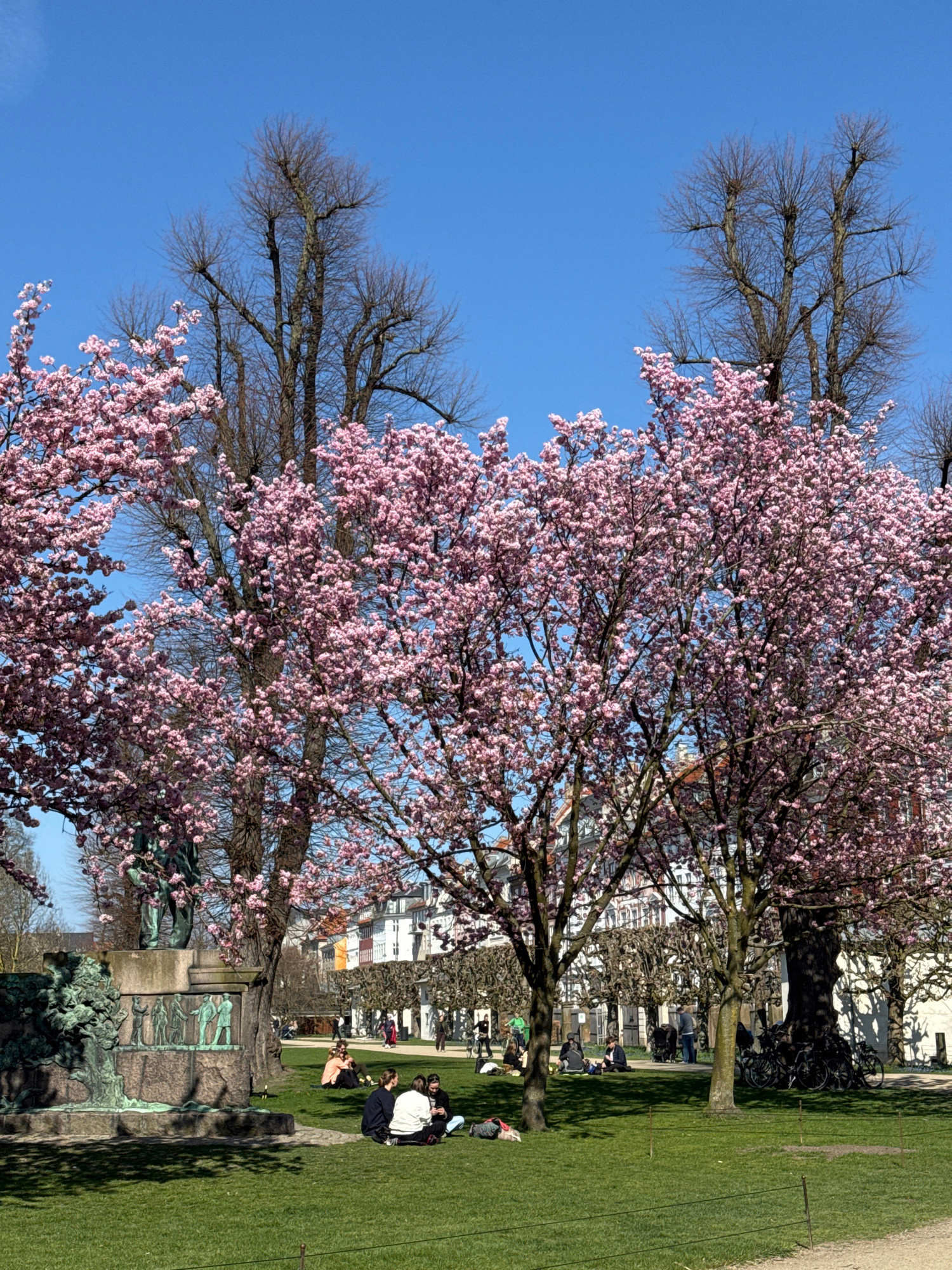A vibrant spring scene unfolds in a public park in Copenhagen, Denmark, under a clear, bright blue sky. The image captures a sunny day, likely in the morning or early afternoon, with people enjoying t…read more