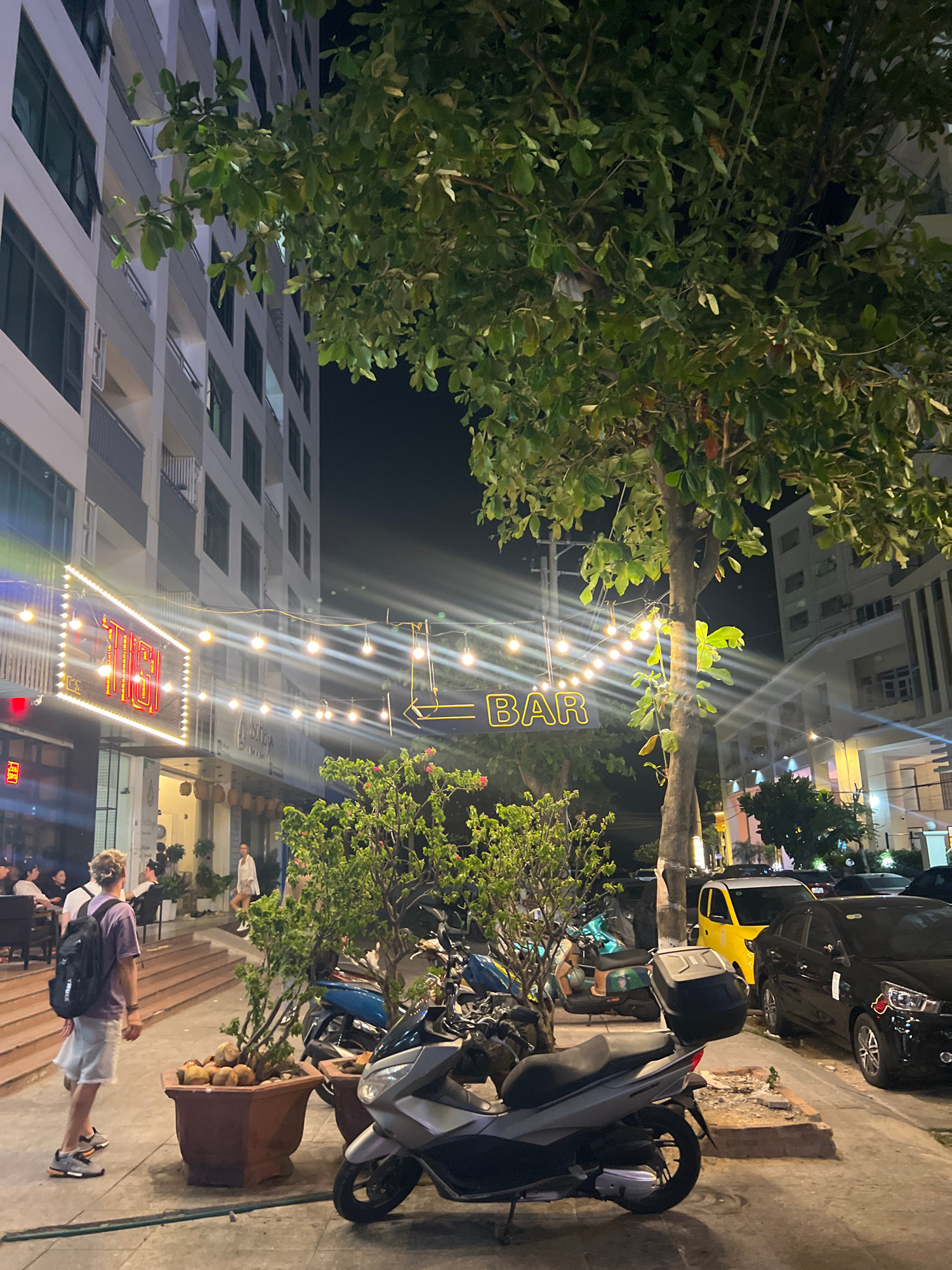 The image depicts an outdoor scene at night in what appears to be Bắc Nha Trang, Vietnam. The perspective is from street level, tilted upwards. Buildings: A tall, white building with numerous windows…read more