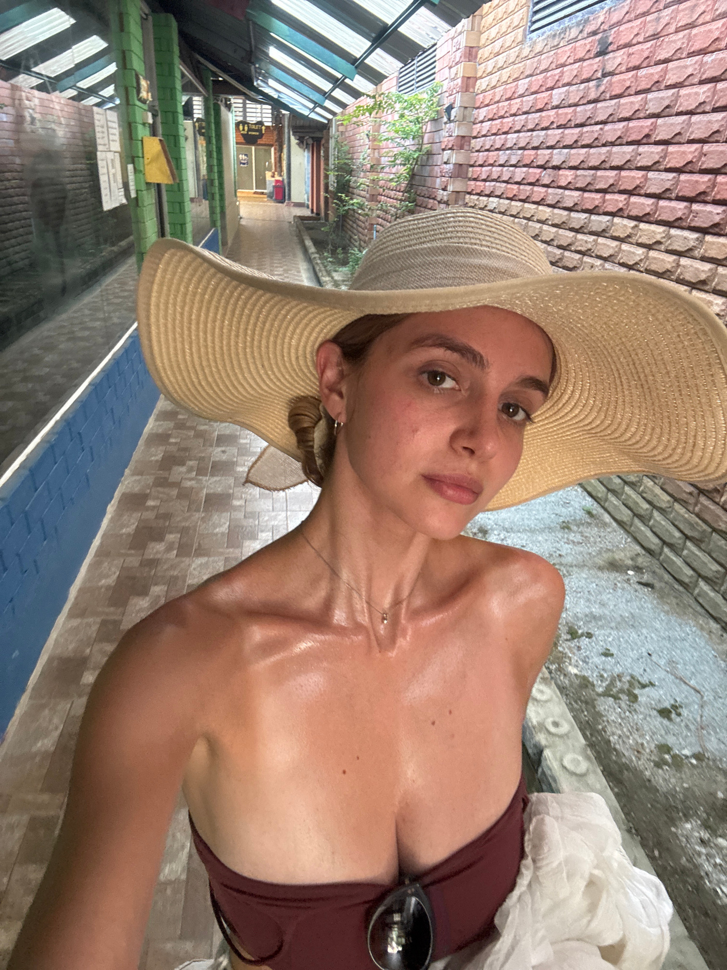 A woman with fair skin, wearing a large straw hat and a maroon bathing suit, is posing for a picture. The background features what appears to be a therapeutic pool setting. There are multiple pools wi…read more