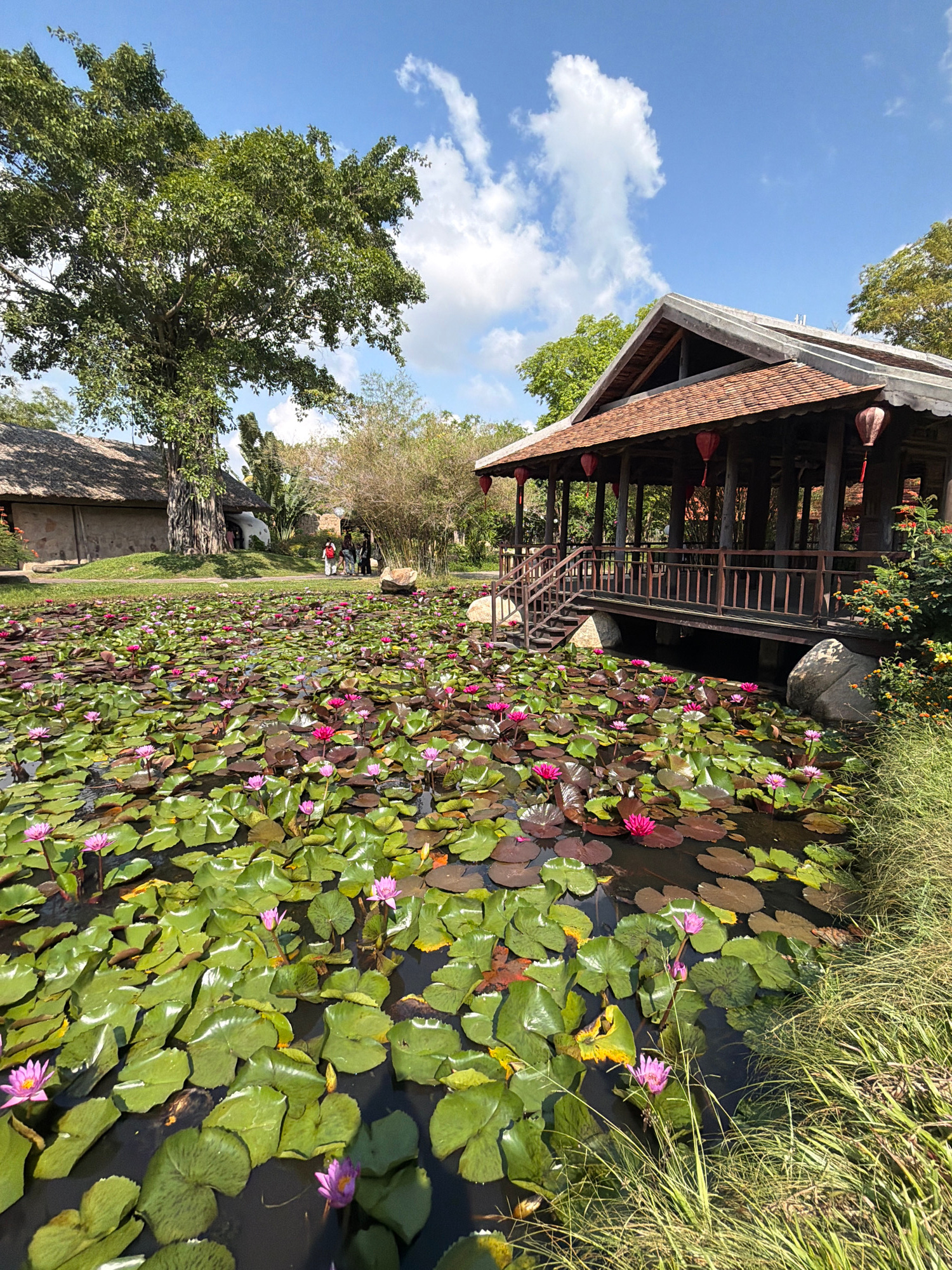 The image depicts a tranquil scene within the Tay Natural Heritage Area in Trang, Vietnam. A traditional wooden structure, possibly a pavilion or gazebo, stands at the edge of a lotus pond. The pond i…read more