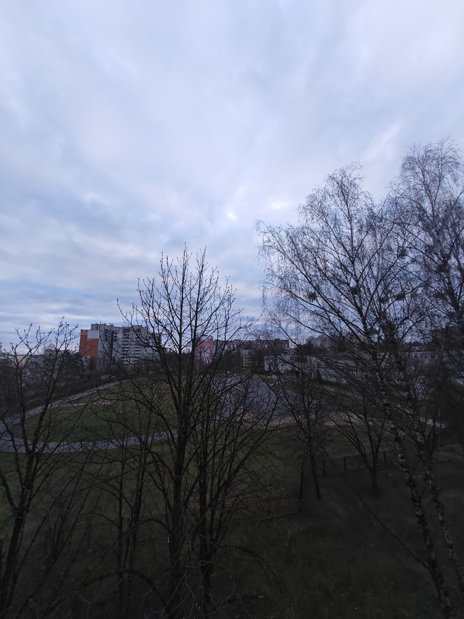 The image depicts a view from a high vantage point, possibly a building in the city of Hrodna, Belarus. The foreground contains dark, leafless trees occupying the lower half of the frame. Beyond the t…read more