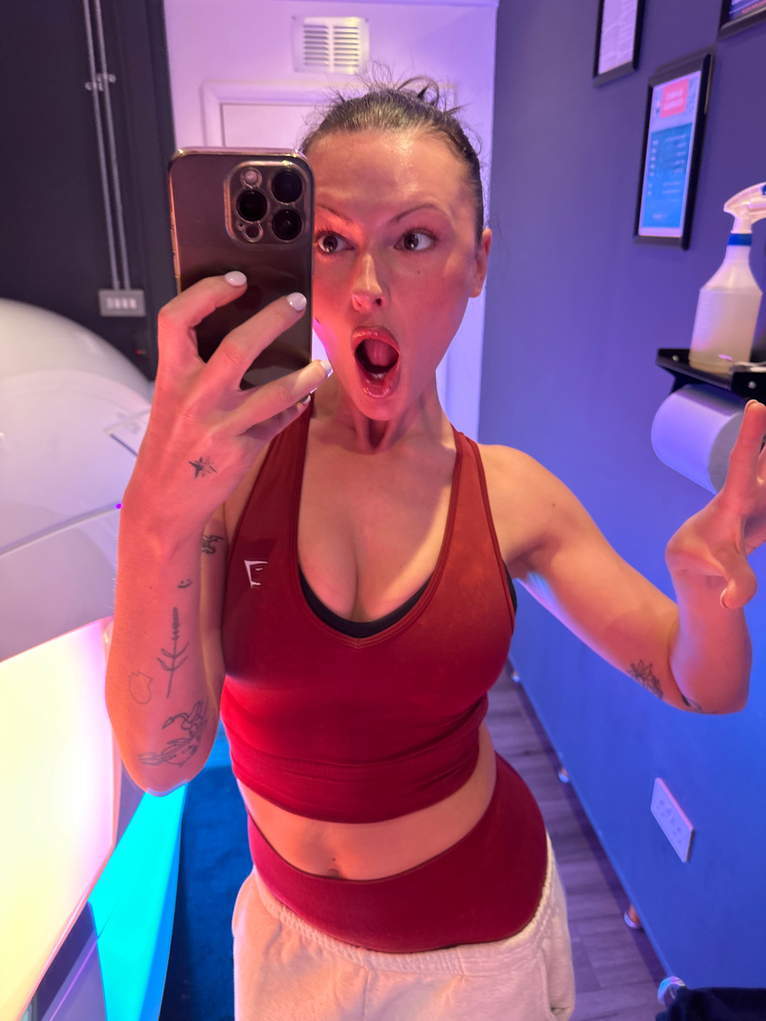 A female subject is depicted taking a mirror selfie within what appears to be a commercial establishment, specifically a tanning or wellness center, located in Tunbridge Wells, United Kingdom. She wea…read more