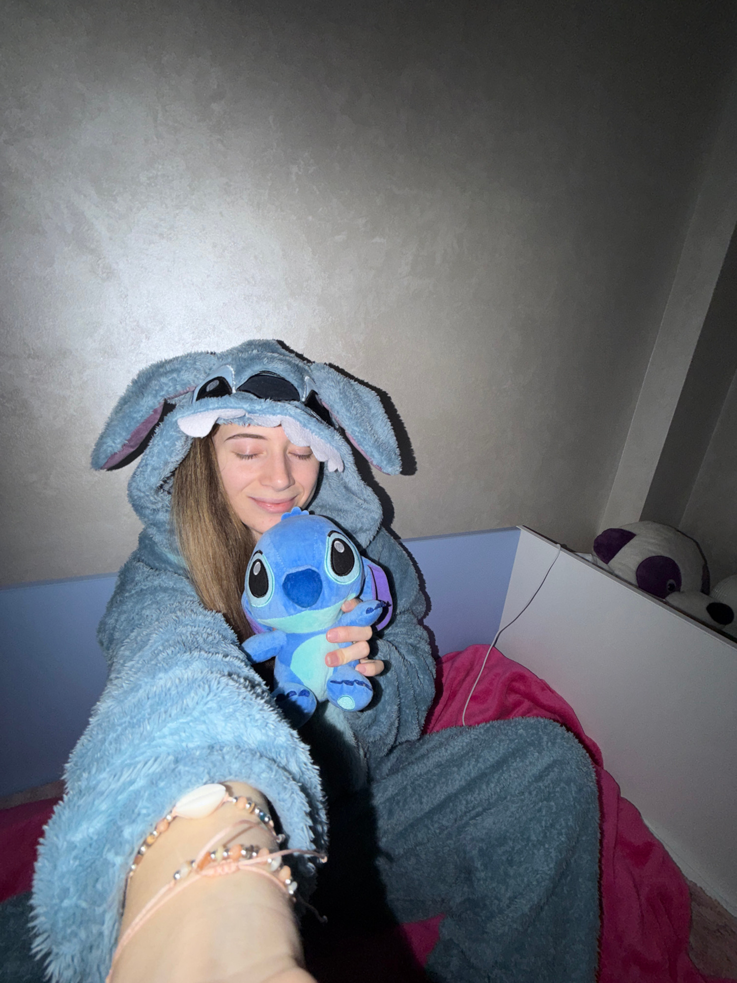 A person is lying on a bed, wearing a light blue, fluffy onesie resembling a cartoon character, and holding a plush toy that resembles the same character. The person is facing upwards towards the came…read more