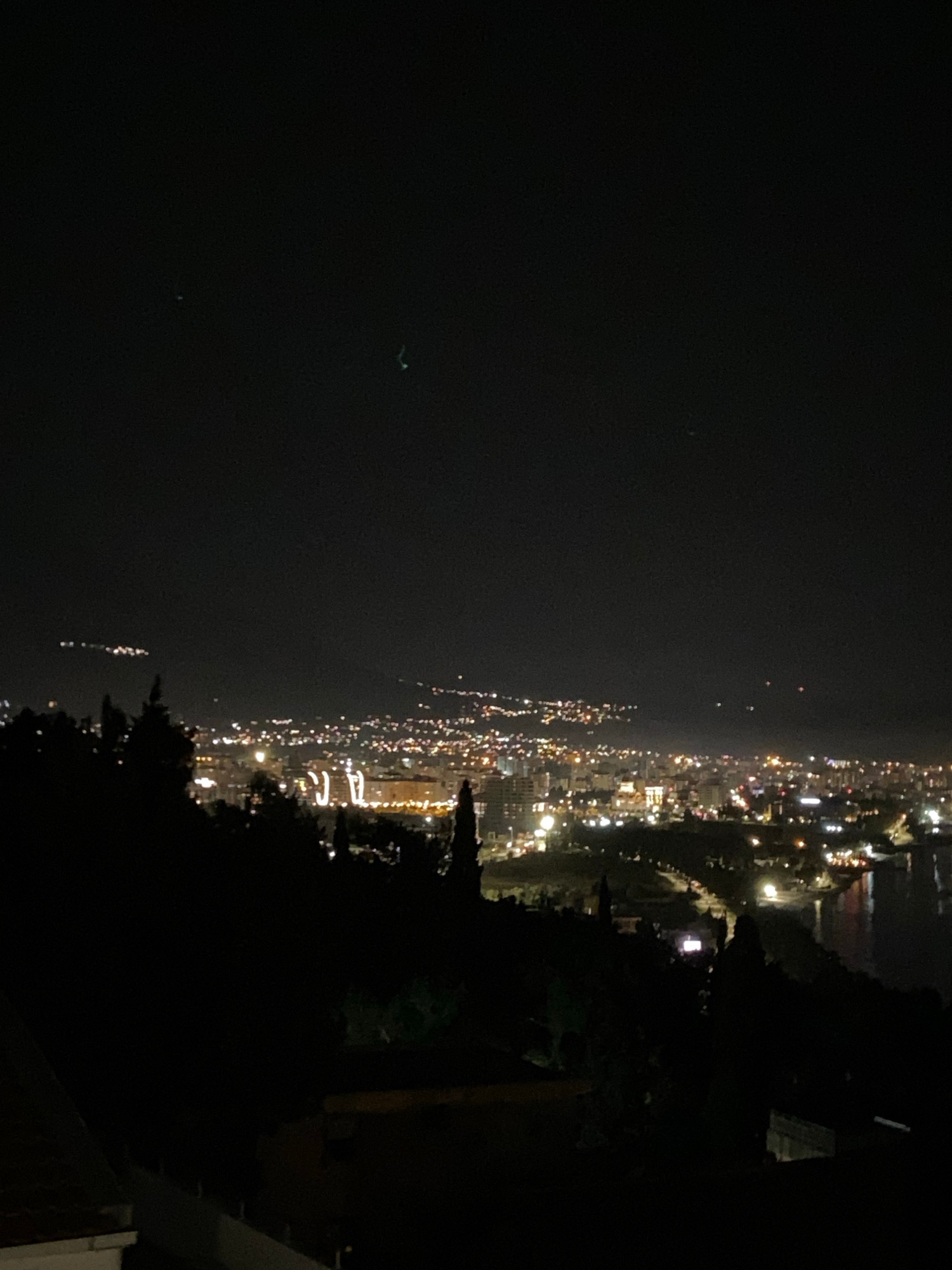 Nighttime view of a city from an elevated position, possibly Šušanj, Montenegro, showing a coastline with lights. The foreground consists of dark foliage and a partial structure, likely vegetation and…read more