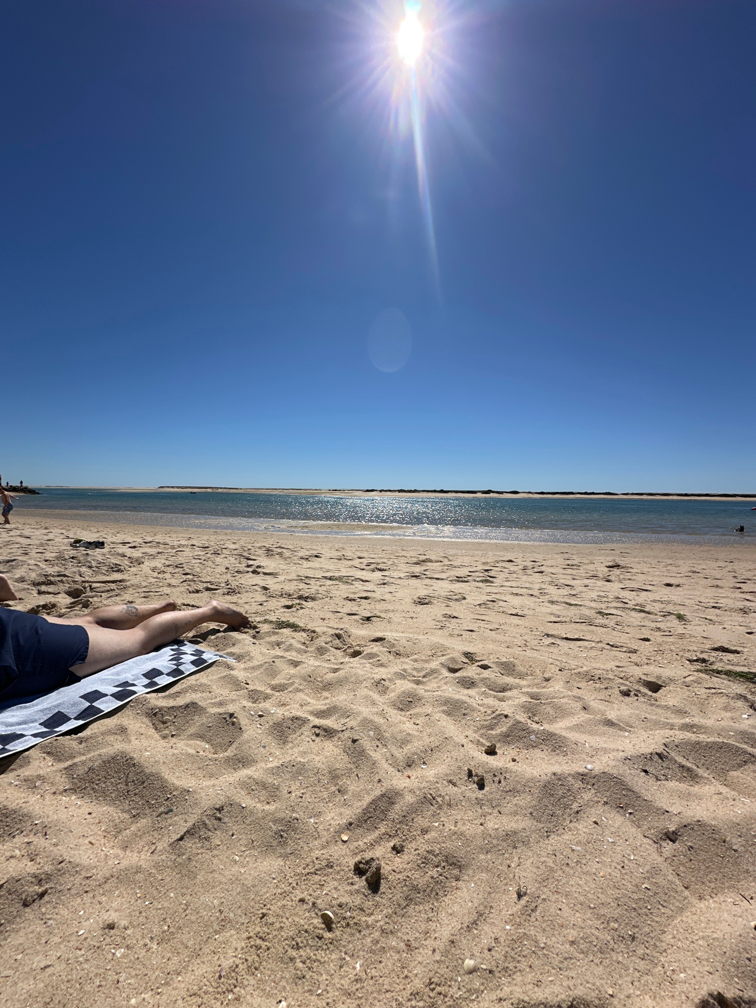 The image presents a beach scene in Olhão, Portugal. A bright sun shines in the upper left corner of a clear blue sky. In the center of the image, a thin strip of water separates the sky from a sandy…read more