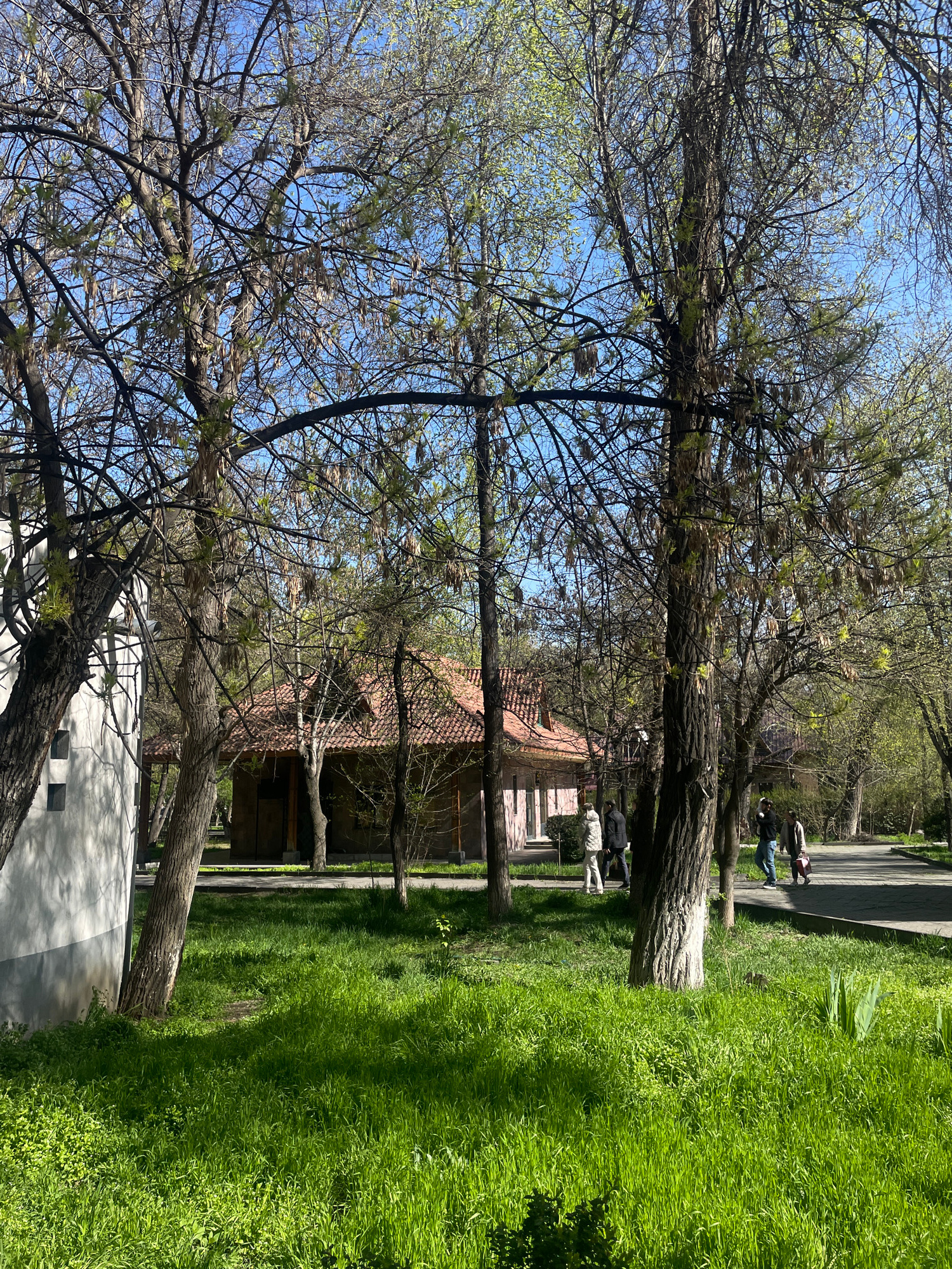 The image shows a scene in Yerevan, Armenia, with a line of trees alongside a grassy area and a building with a red-tiled roof. The trees have bare branches with some budding leaves, and the sky is vi…read more