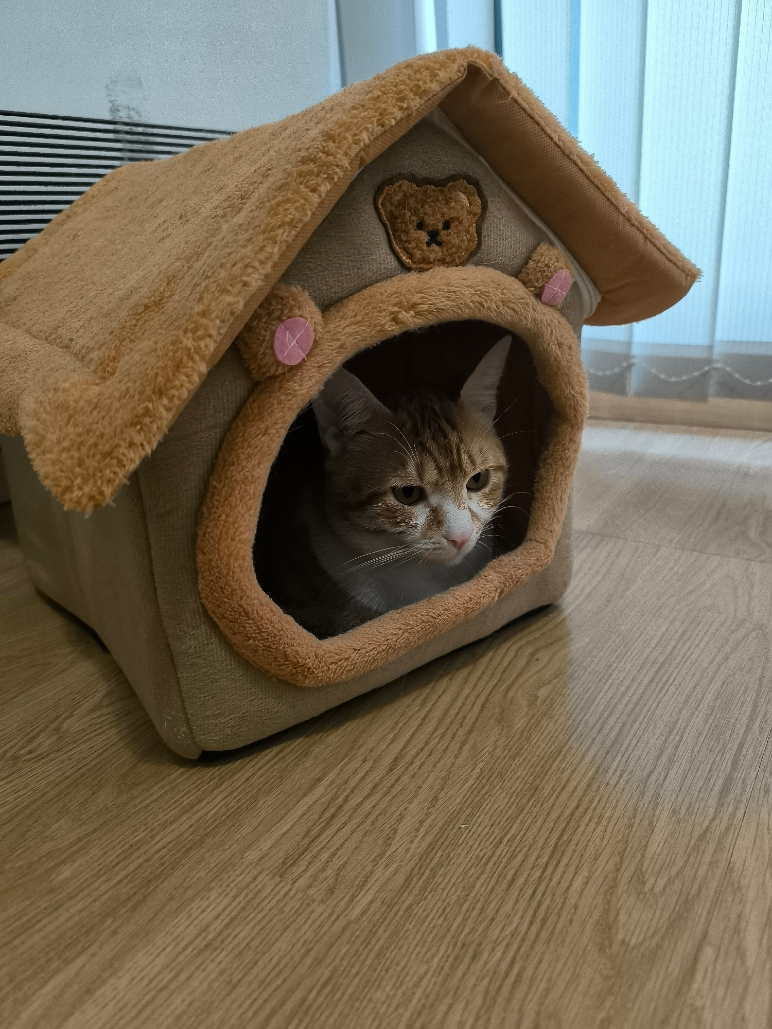 An indoor scene features a cat nestled inside a soft, house-shaped cat bed. The cat has orange and white fur. The bed is primarily beige with brown, fuzzy trim around the roof and entrance. A brown be…read more