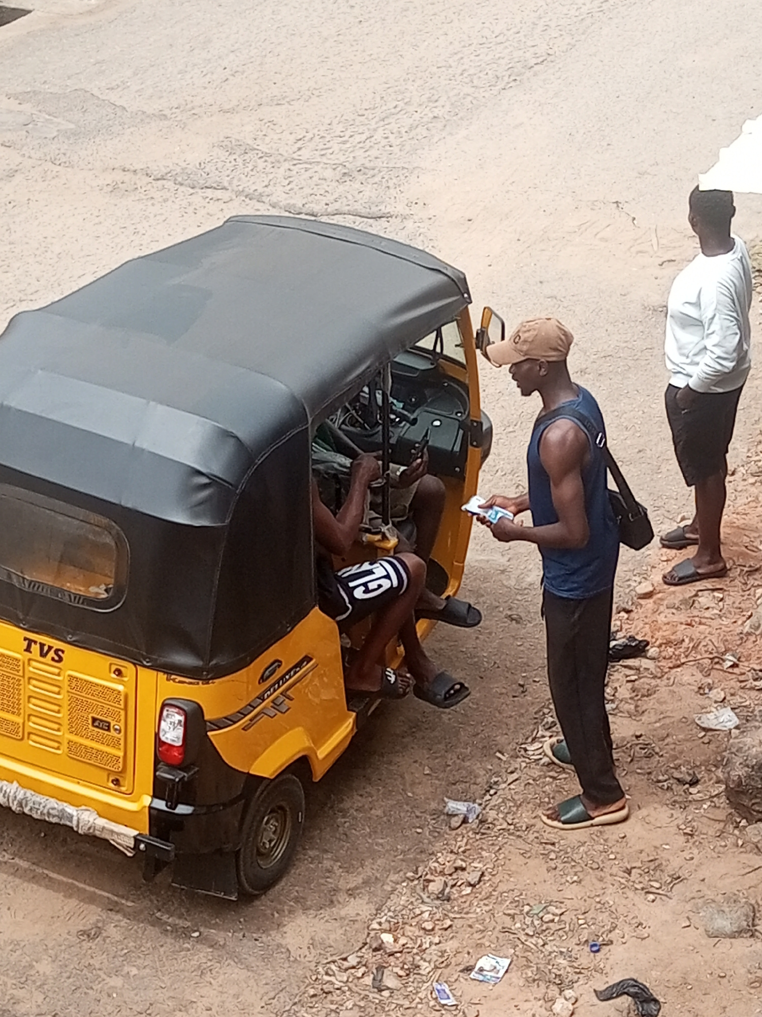 A high-angle, medium shot shows a yellow and black TVS tricycle, known as a "keke", parked on a dirt and gravel patch next to a paved road in Onitsha, Nigeria. Two passengers sit inside the keke, one…read more