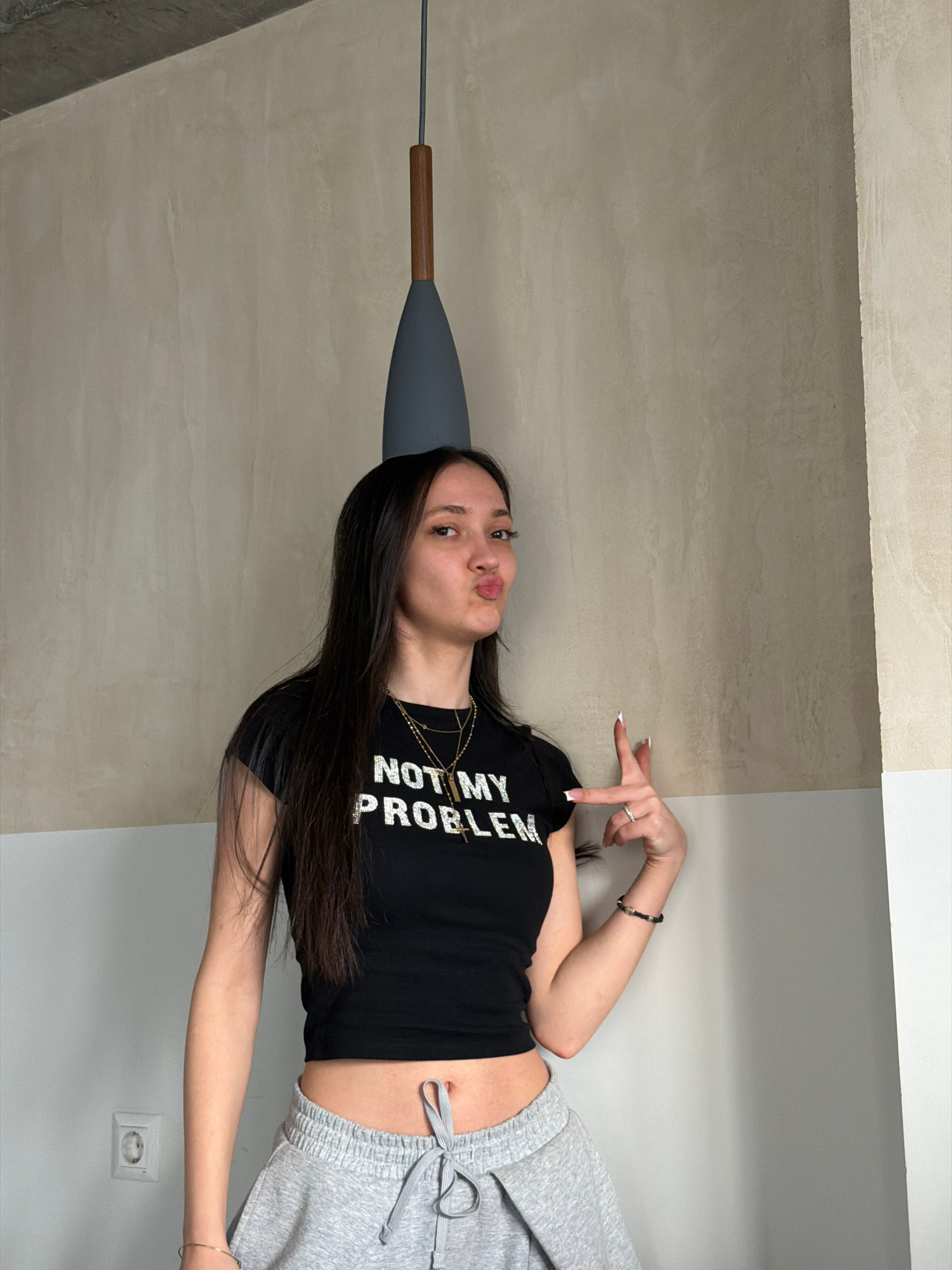 A woman stands indoors. She wears a black t-shirt with "NOT MY PROBLEM" in white lettering, gray sweatpants, and jewelry. She has dark hair and fair skin. Her left arm is raised with fingers extended…read more