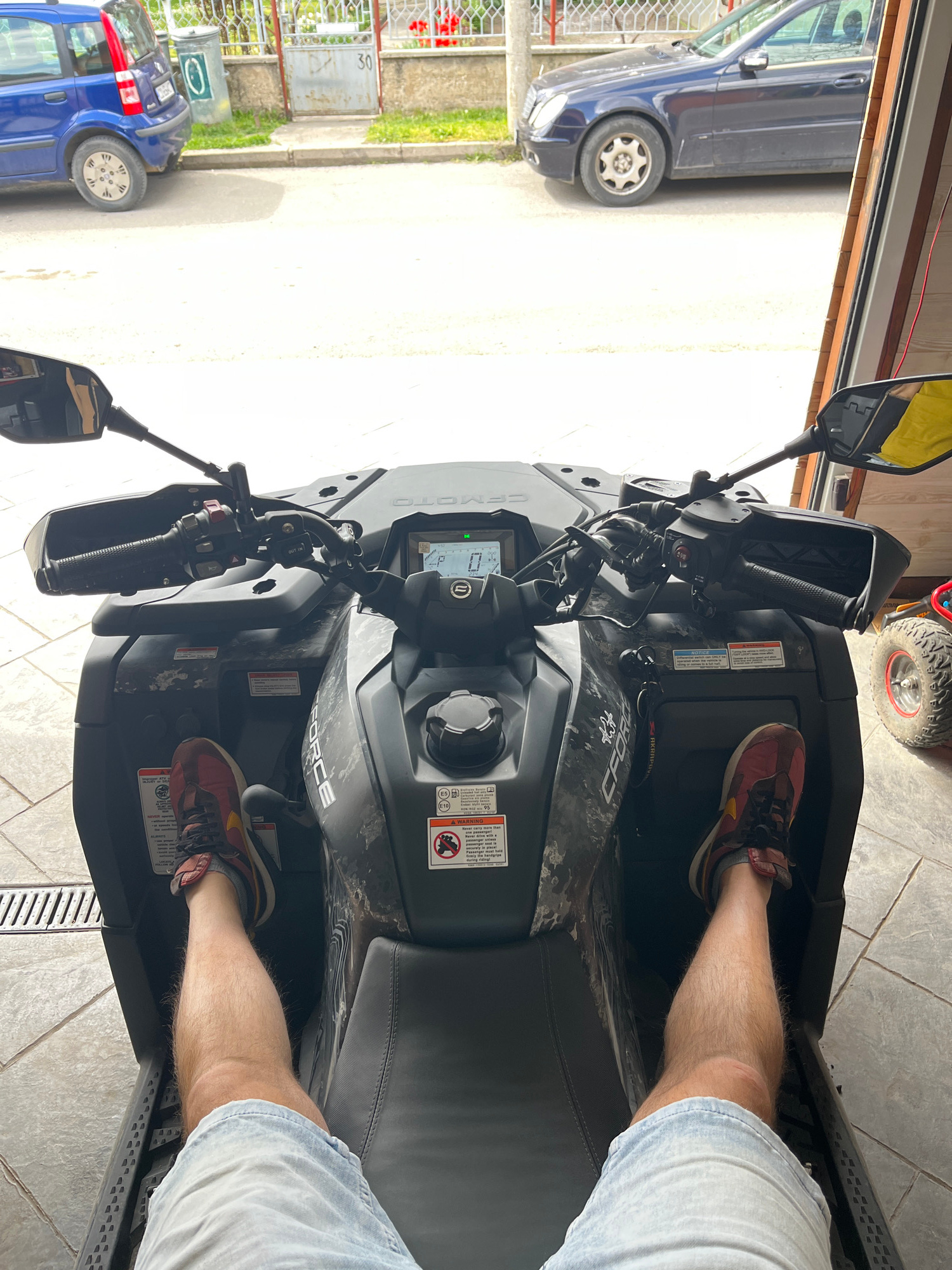 A top-down, slightly rotated view captures a person seated on a CFMOTO CFORCE ATV, positioned within the open entrance of a garage or carport. The person's lower legs and feet are visible, wearing lig…read more