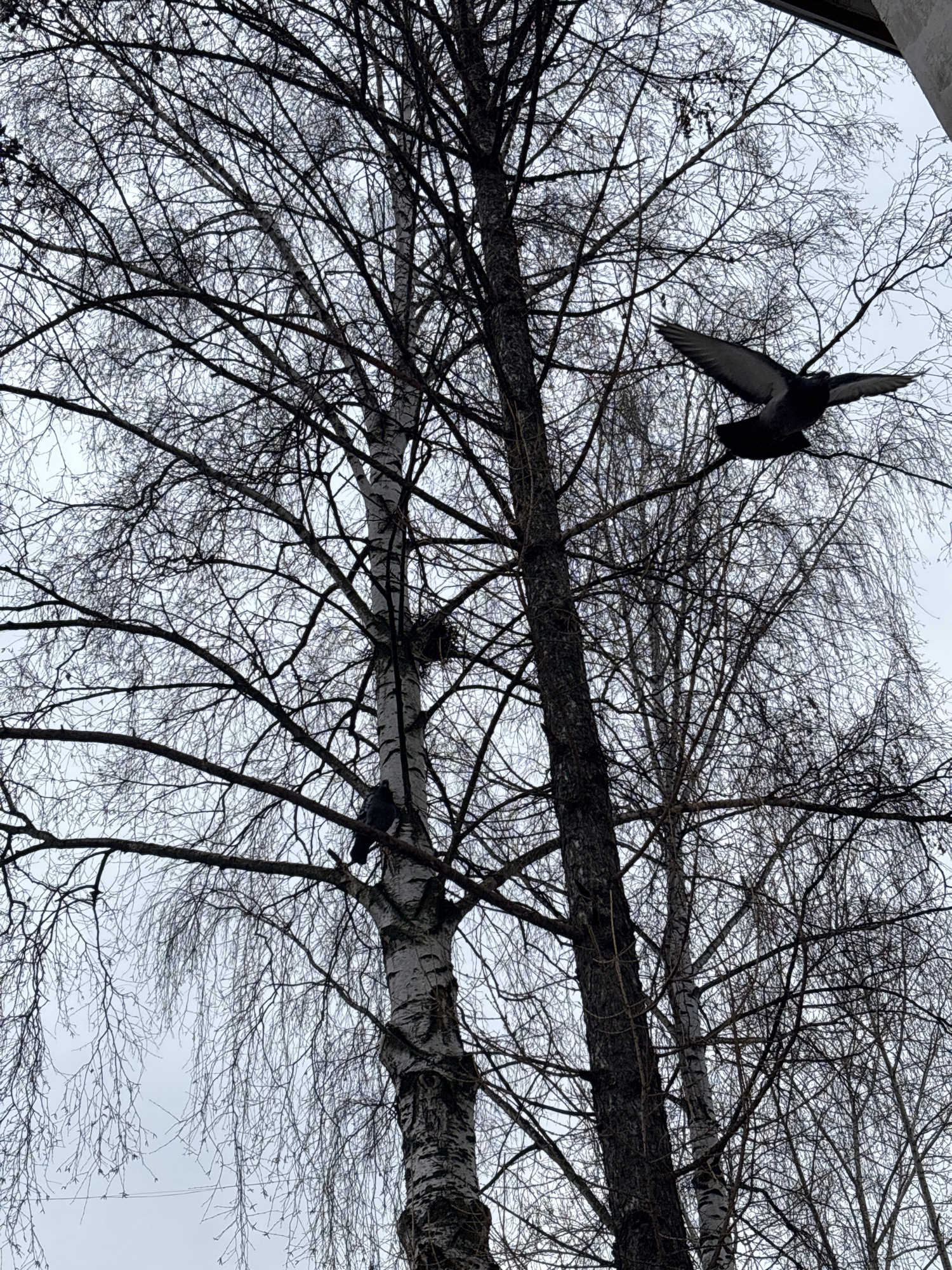 The image, taken from a low angle looking upwards, depicts a birch tree in winter against an overcast sky. The tree has bare branches, intertwined, with two prominent horizontal branches. A large bird…read more