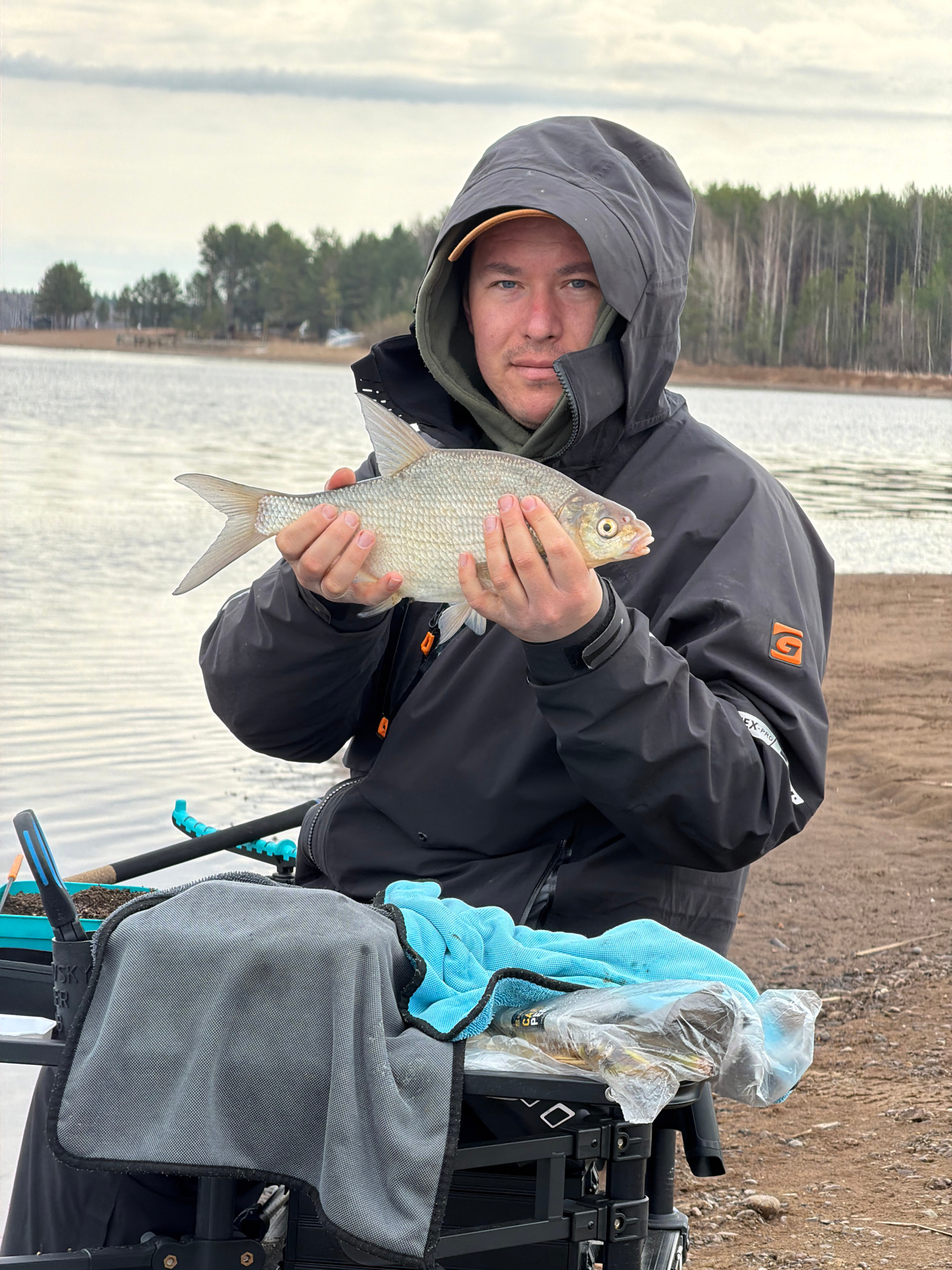 A man in a dark jacket with a hood is holding a fish. The background features a body of water, likely a river or lake, and a shoreline with trees. Other fishing equipment, like a black frame and a blu…read more