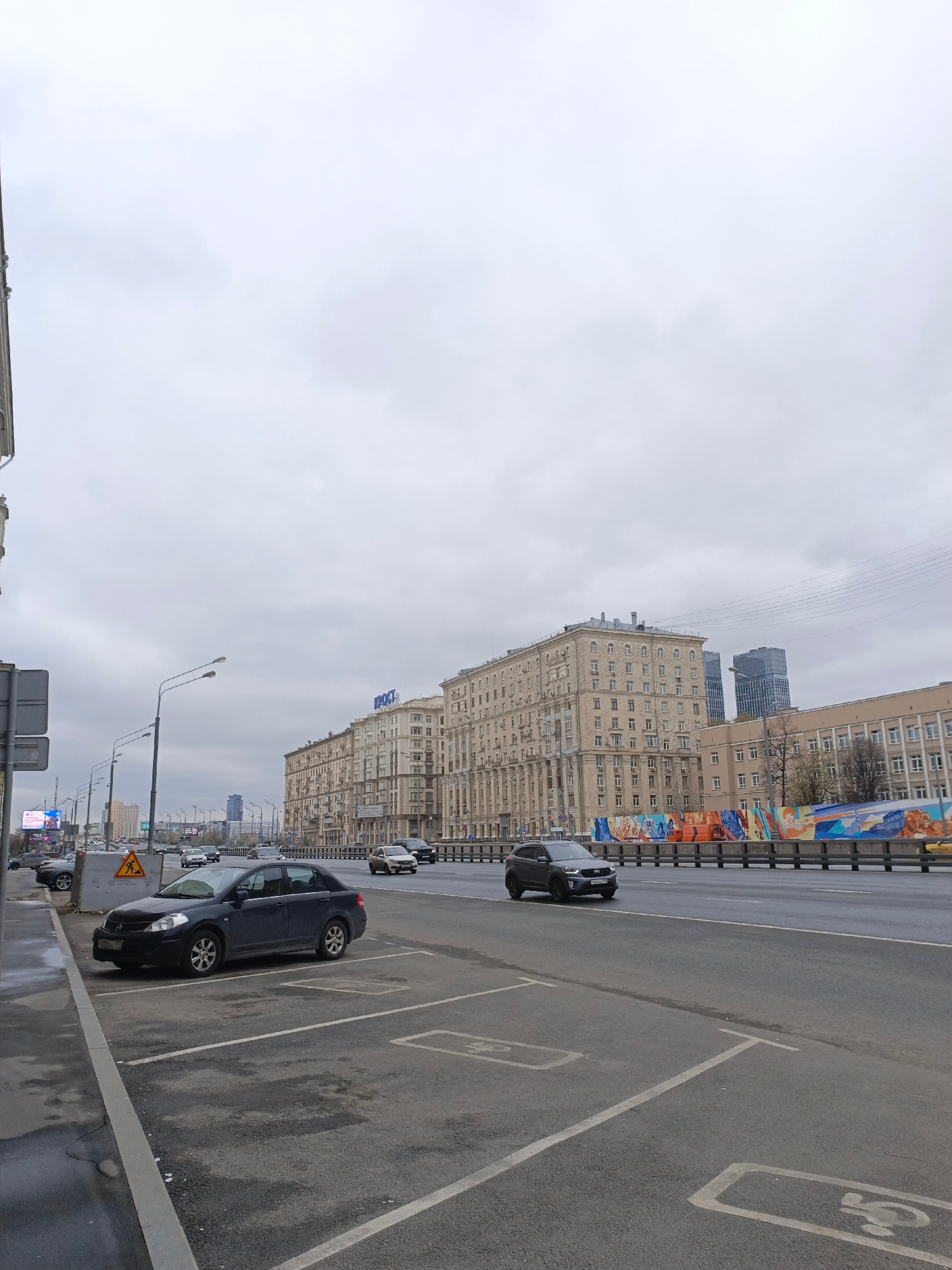 The image depicts a street scene in Moscow, Russia, on an overcast day. A dark blue Nissan Tiida is parked in a designated parking space. In the background, a row of buildings is visible, with the wor…read more