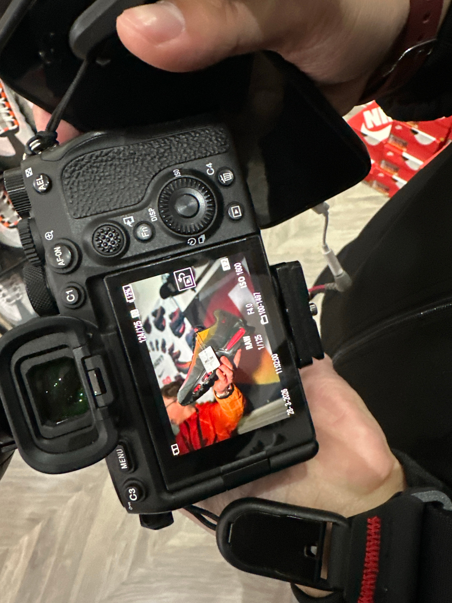 A person is depicted holding a black Sony Alpha series mirrorless camera with both hands, viewed from a first-person, overhead perspective. The camera's articulating LCD screen is activated, displayin…read more