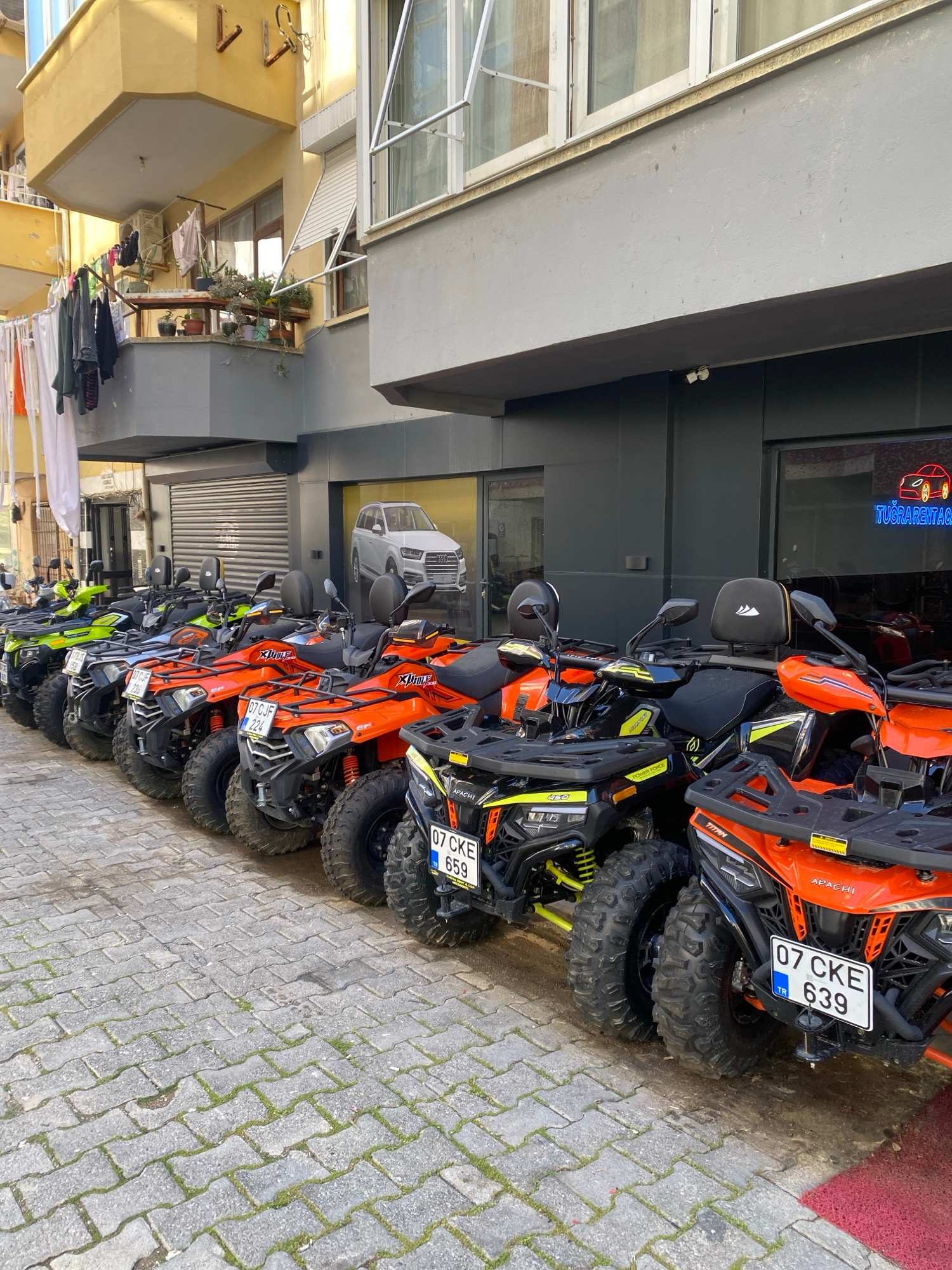 A row of all-terrain vehicles (ATVs), primarily orange and black, are parked along a paved sidewalk. Several license plates are visible, reading "07 CKE 639" and "07 CJF 224". The ATVs are parked in f…read more