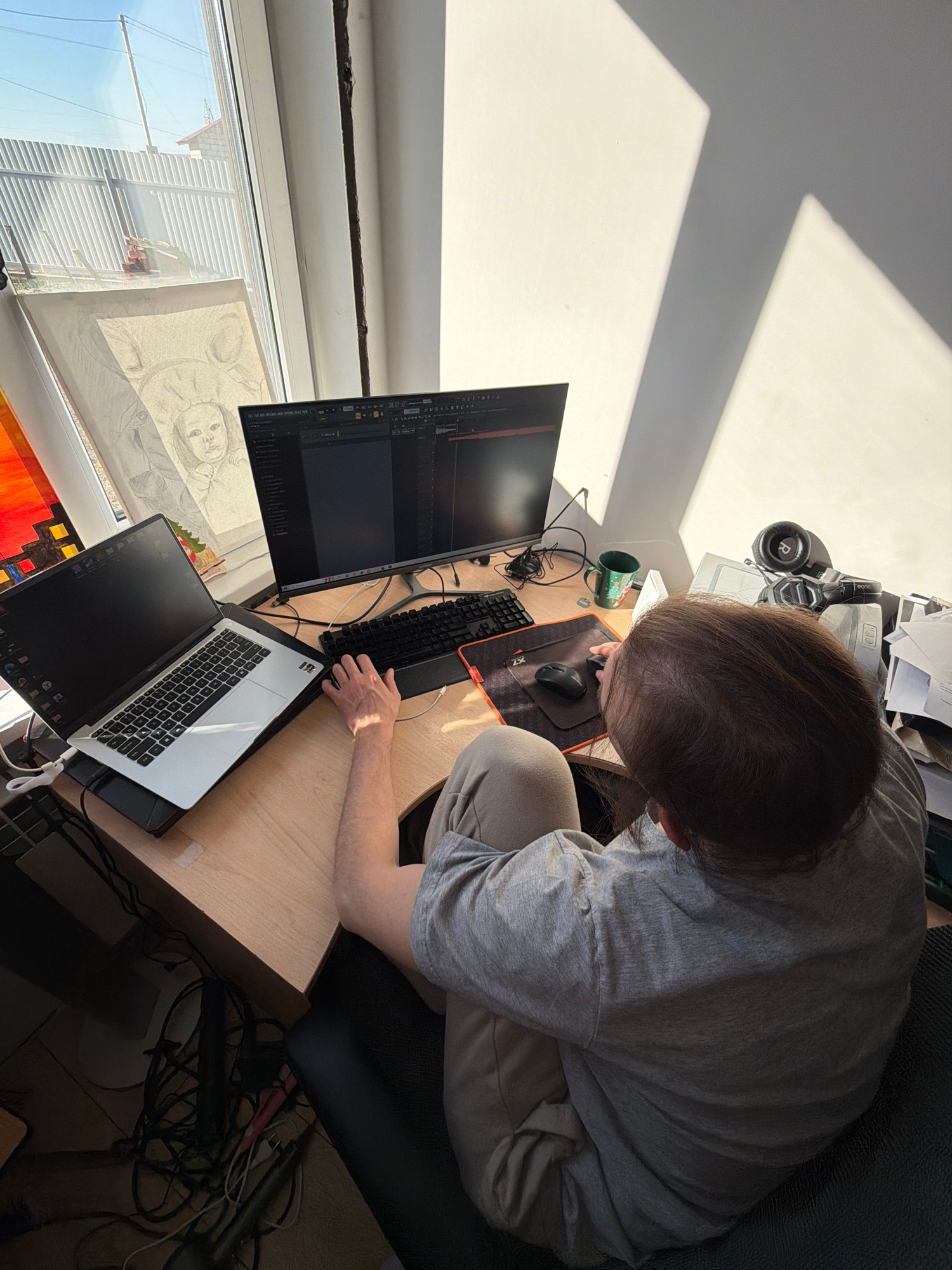 An overhead shot captures a person working at a sunlit desk in Chaikovsky, Russia. The individual, with short brown hair, wears a light grey t-shirt and beige pants, seated with their back partially t…read more