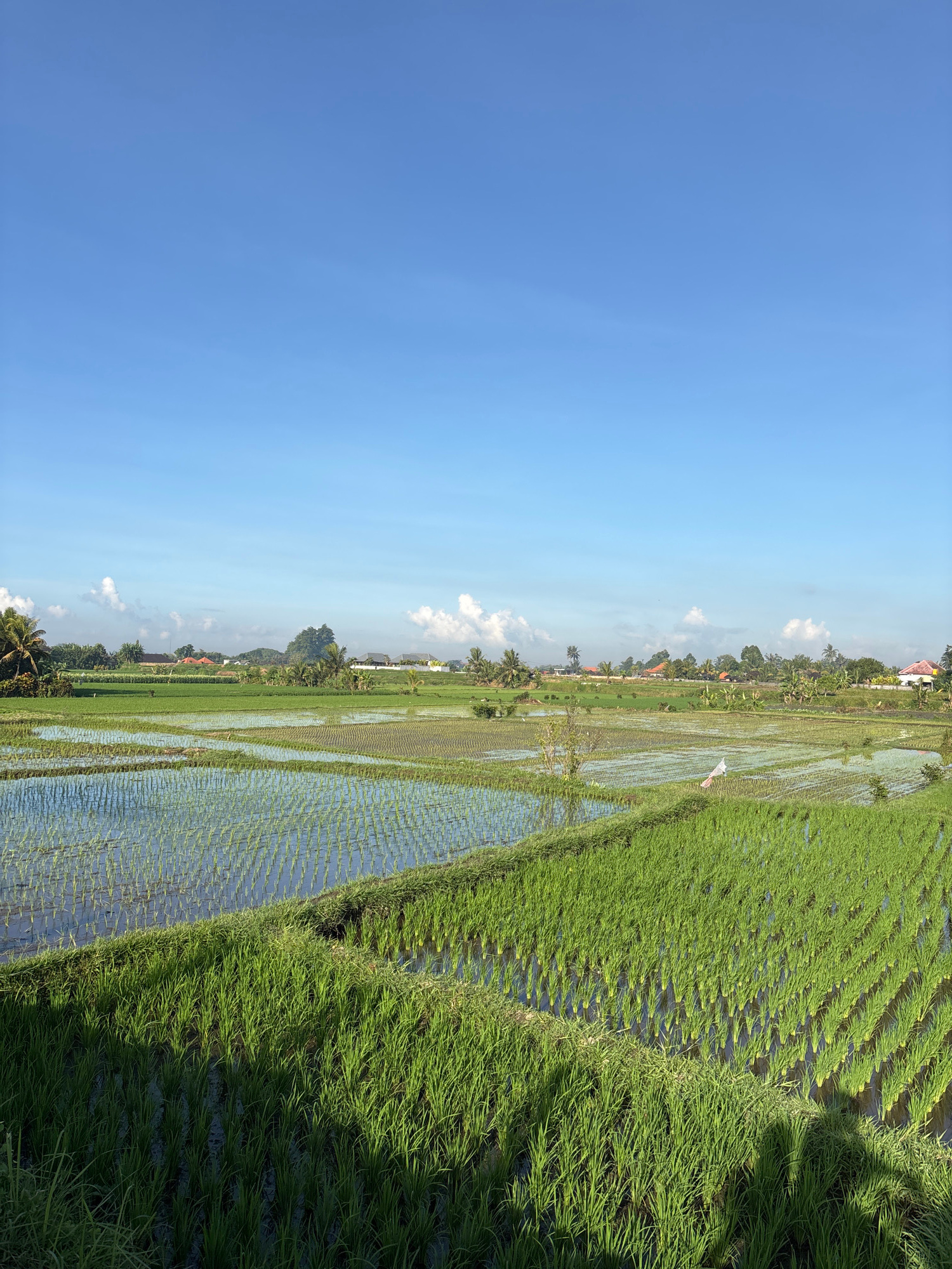 The image depicts a lush, green rice paddy field in Abiansemal, Indonesia, under a clear blue sky dotted with scattered white clouds. The rice plants are at various stages of growth, with some areas fâŚread more