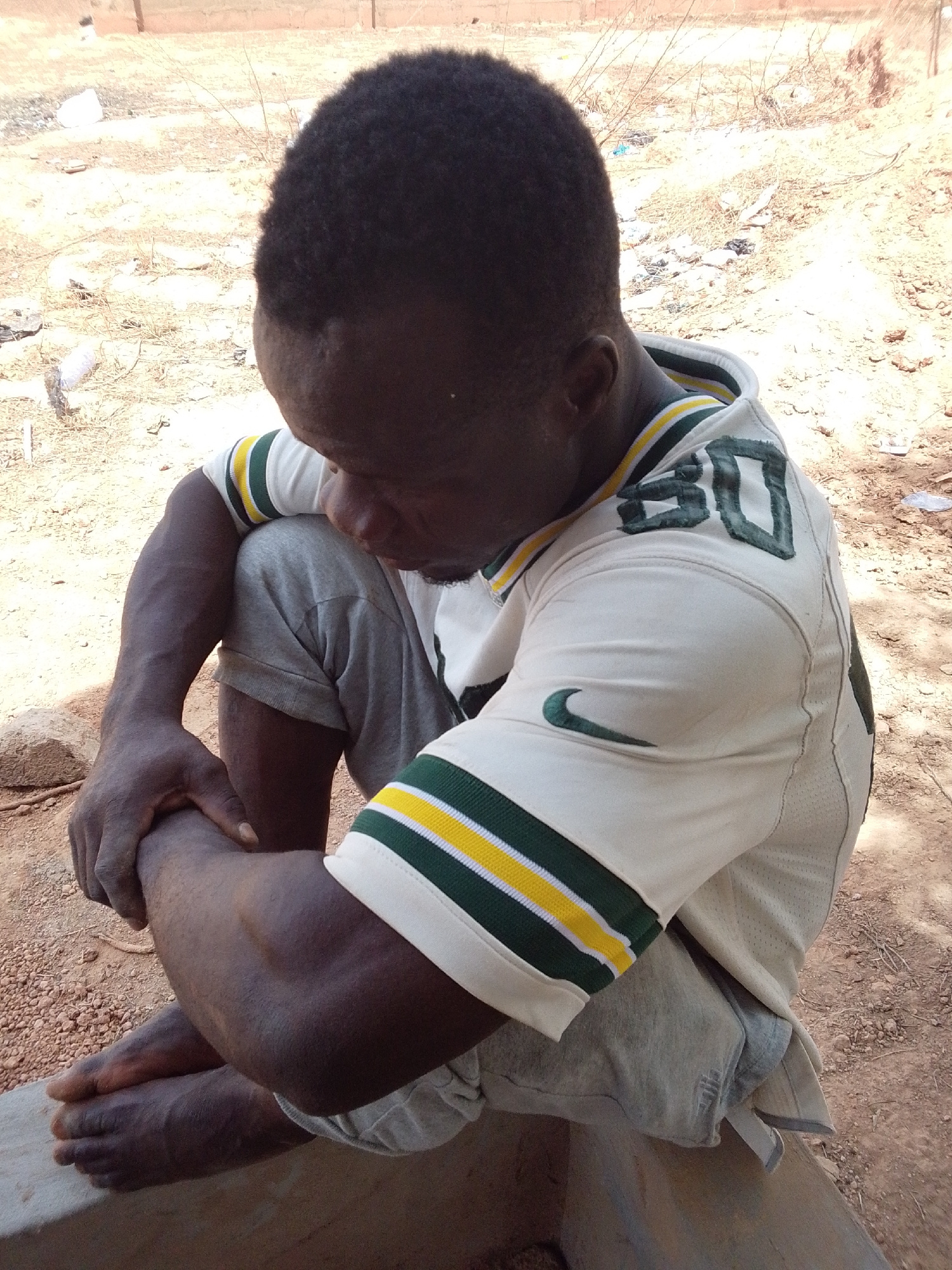 A man sits on a concrete ledge in an outdoor environment. The ground is reddish-brown dirt with sparse vegetation and scattered debris. He is wearing a white t-shirt with green and yellow stripes on t…read more
