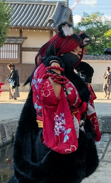 A costumed individual stands prominently in the foreground of an outdoor scene at Toei Kyoto Studio Park, Kyoto, Japan. The central figure has red and black streaked hair, adorned with black fur-trimm…read more