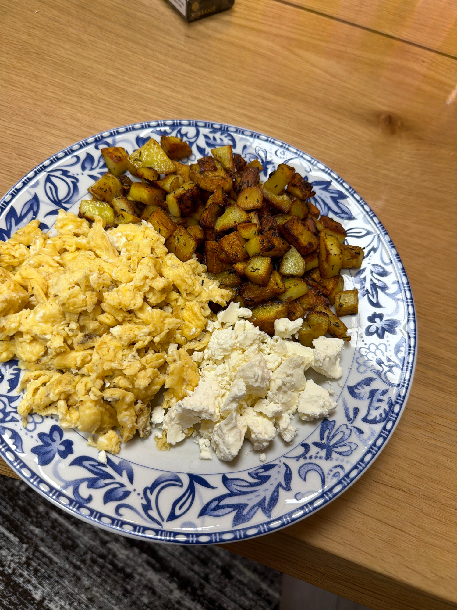 A top-down view shows a plate of food on a wooden surface. The plate, adorned with a blue and white floral pattern, contains three distinct portions: diced, roasted potatoes, scrambled eggs, and crumb…read more