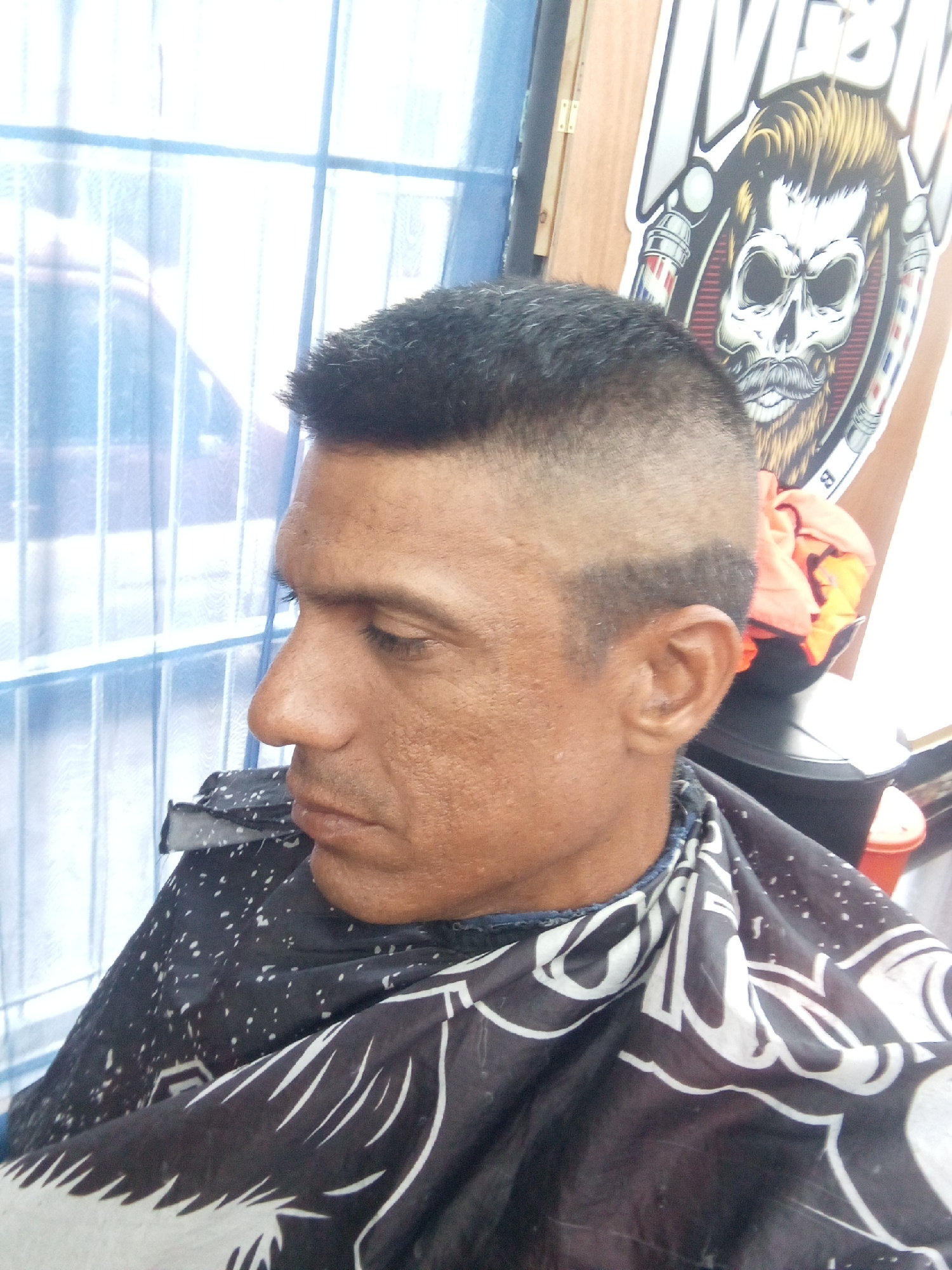 A medium shot depicts a man seated in a barber chair, his head turned to the left. He is wearing a black and white barber cape. The man has short, dark hair, styled in a fade haircut. The background i…read more