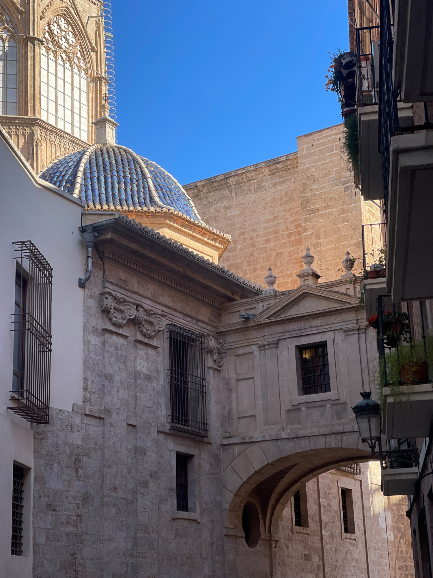 This is a low-angle, outdoor shot showing a building with a tiled dome and stone facade in València, Spain. The blue and white tiled dome is on the left side of the frame, with an adjacent building fe…read more