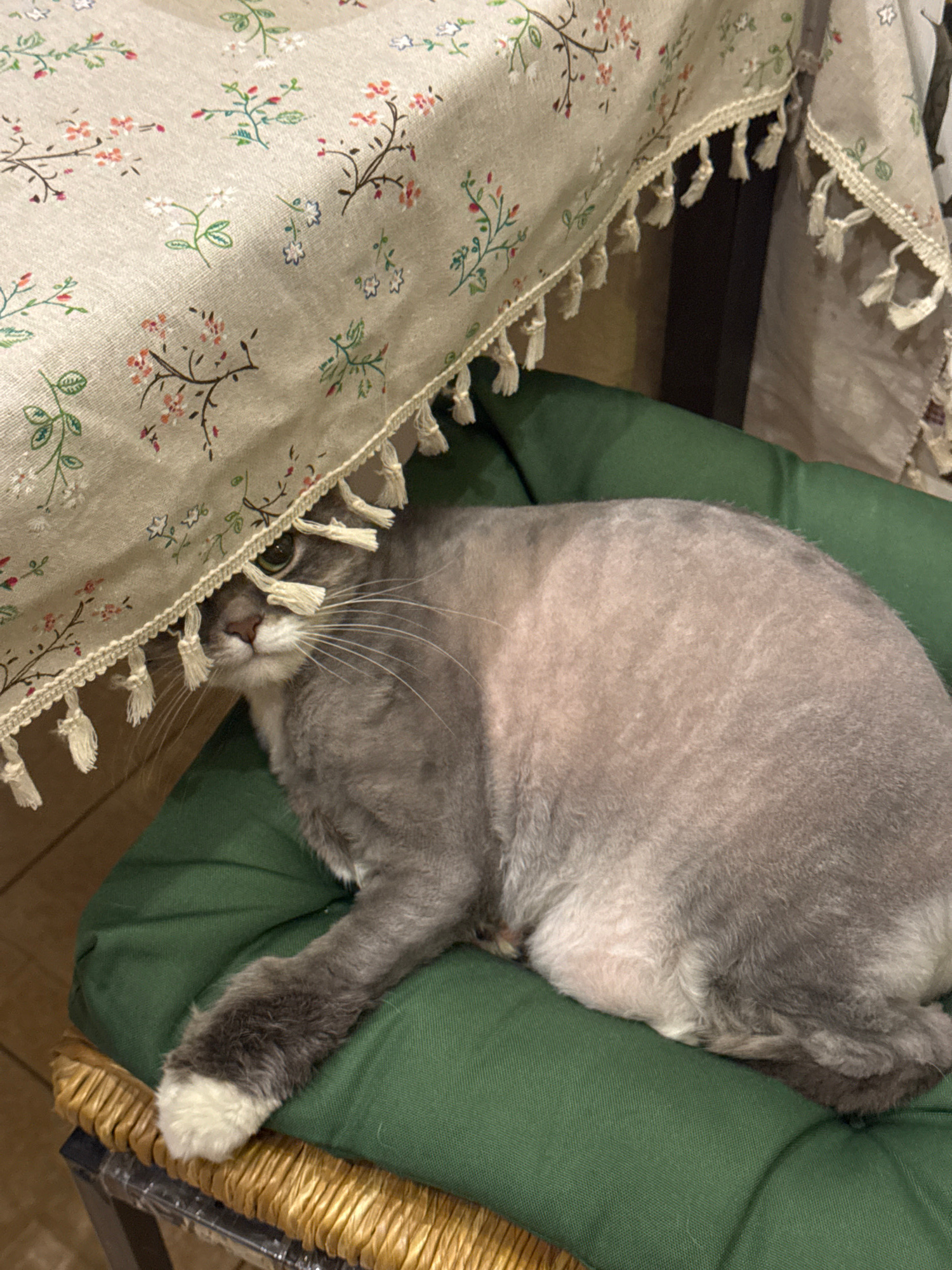 A gray cat is lying on a green cushion. The cat's fur is short and gray, with a darker gray tail and white paws. The cat's head is near a beige blanket with a floral pattern and tassels. The location…read more
