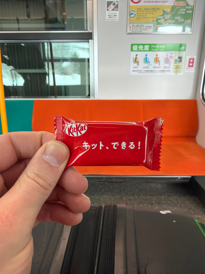 A hand holds a red, Japanese Kit Kat wrapper in an indoor setting, likely a train. The wrapper features the Kit Kat logo and Japanese text. The train interior shows an orange seat back, a window with…read more