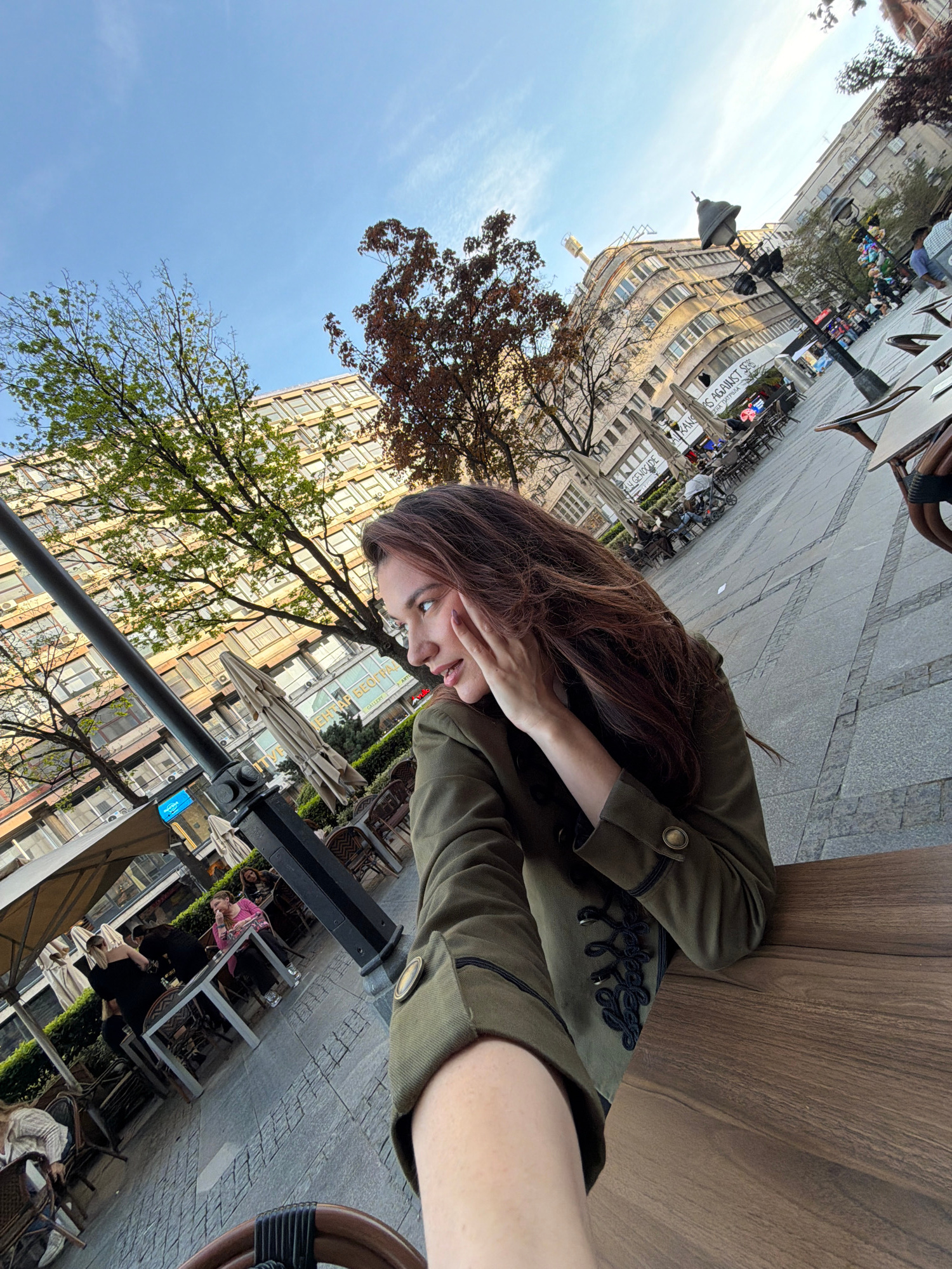 A woman with long brown hair, wearing an olive green jacket with decorative braiding, is sitting at a table in Belgrade, Serbia. The table is situated on a paved outdoor area. Buildings are visible in…read more