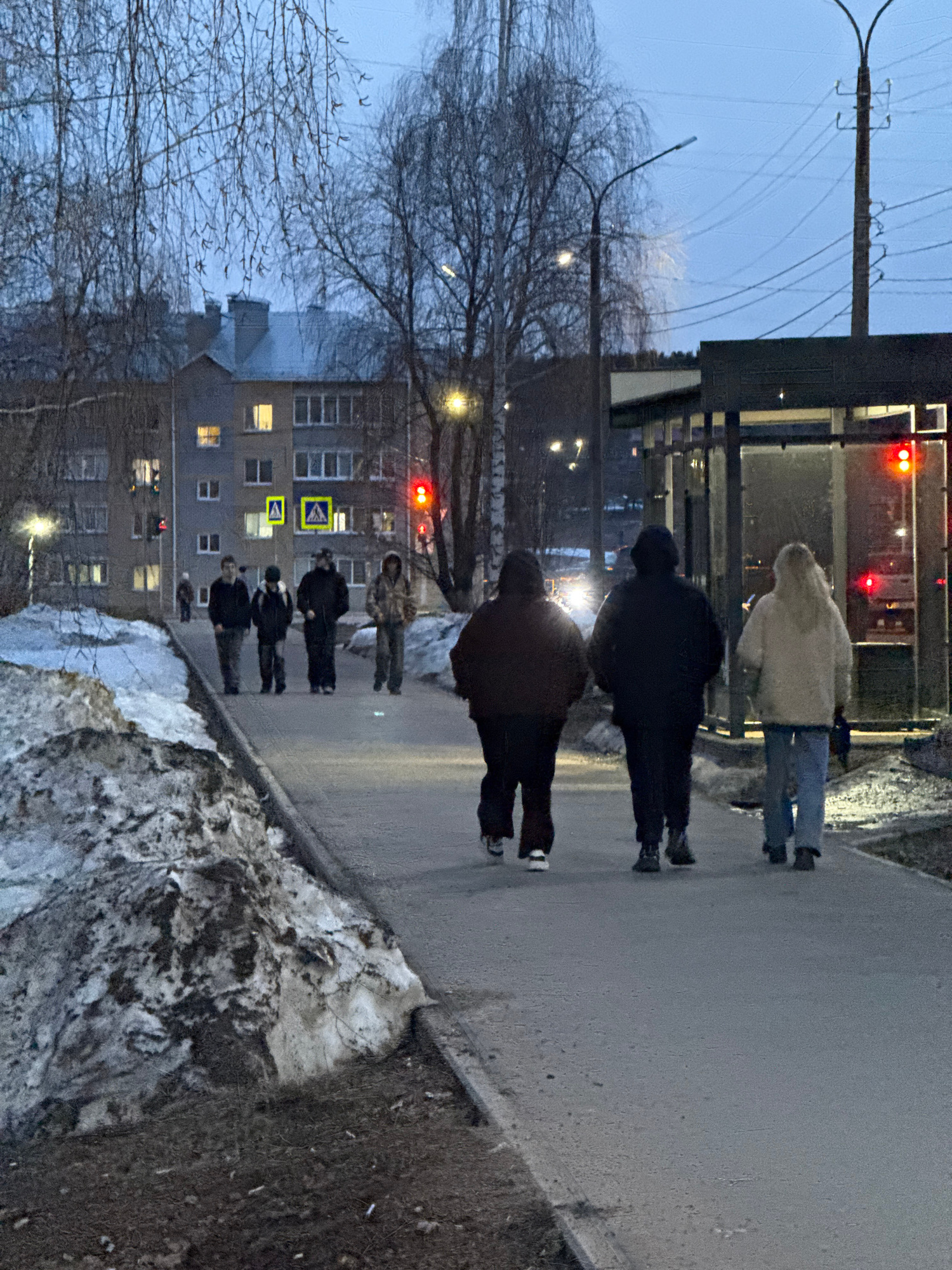 The image depicts an urban scene in what appears to be Votkinsk, Russia, based on the architecture. A group of people are walking along a paved sidewalk. The foreground features melting snow along the…read more