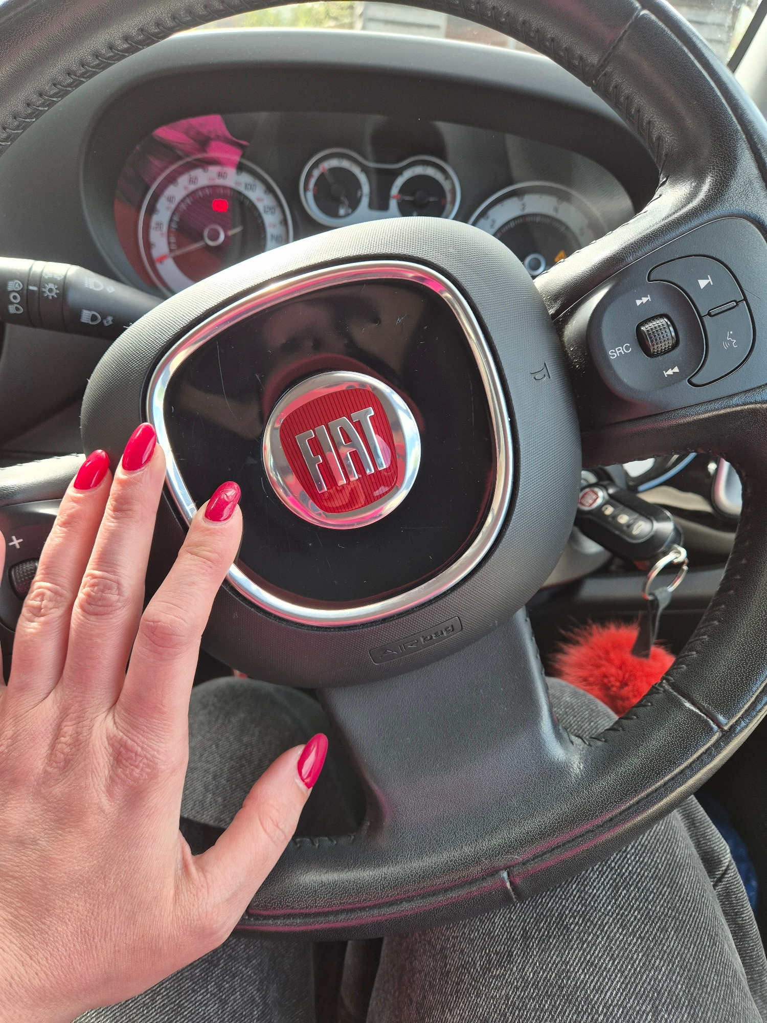 The image depicts the interior of a Fiat car. A person's hand with red nail polish rests on the steering wheel, near the Fiat logo. The steering wheel features buttons for audio and phone control. Car…read more