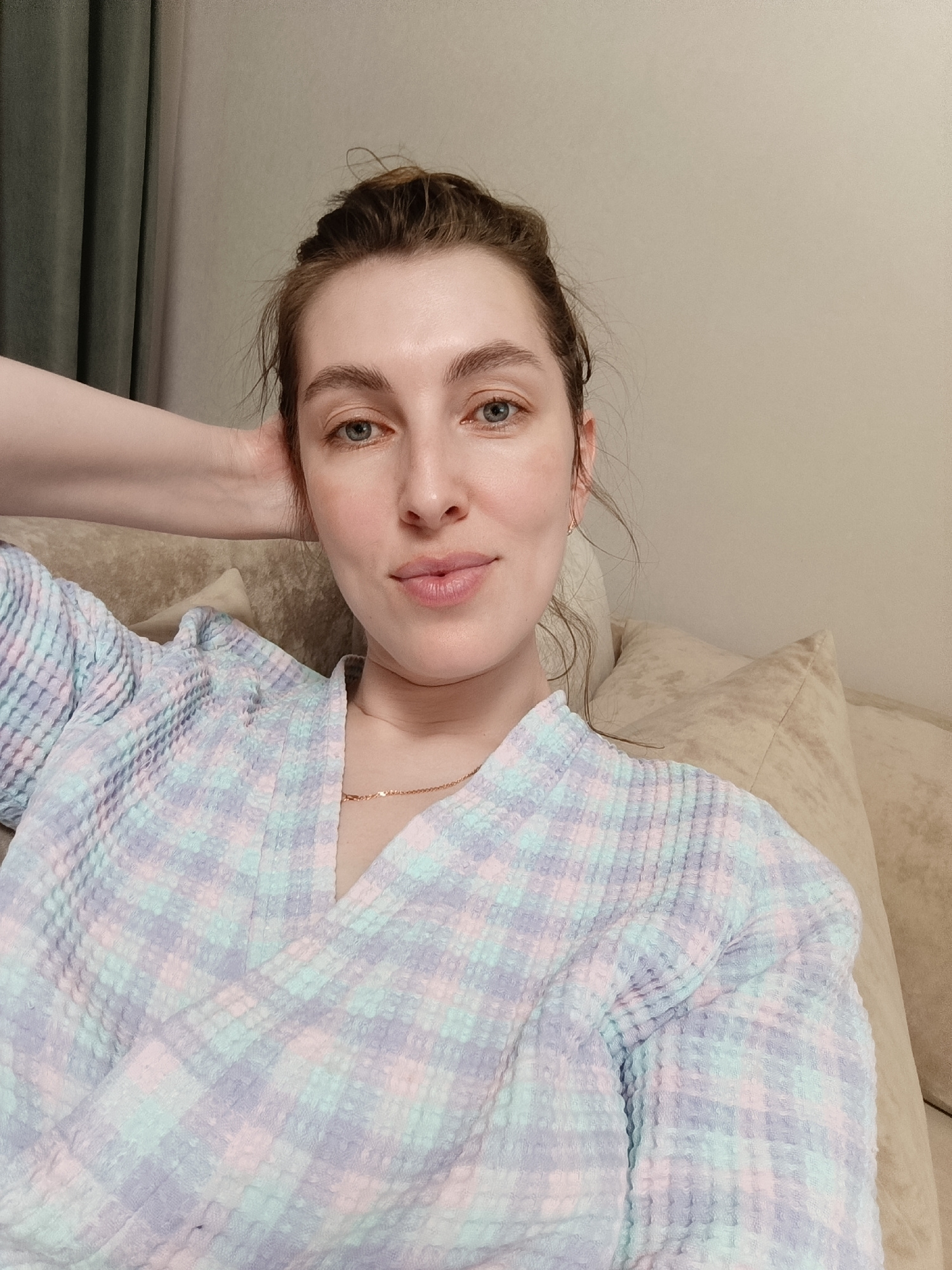 A woman is reclining on a beige couch, wearing a pastel-colored, checkered robe. Her hair is pulled back into a bun, and she is wearing a thin gold necklace. Her left hand is behind her head. The back…read more